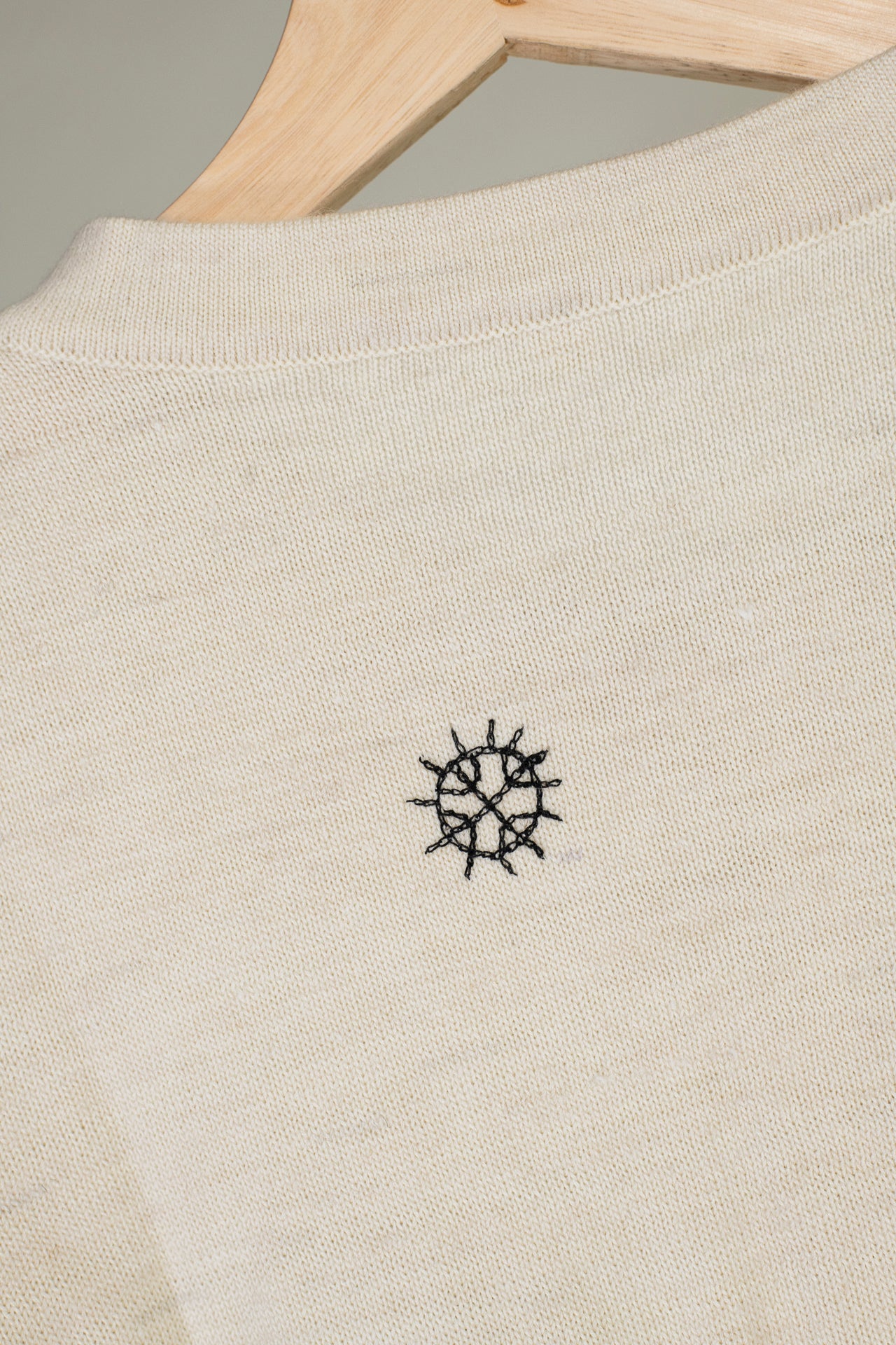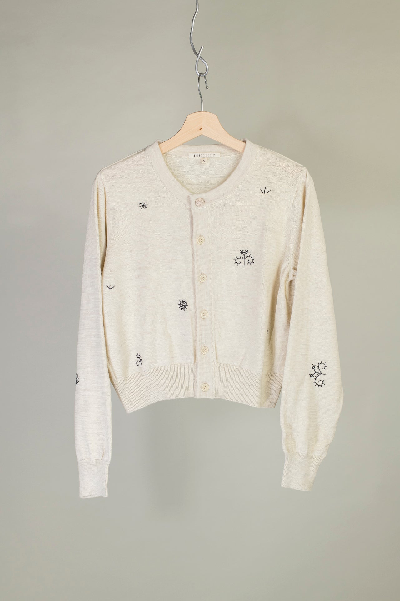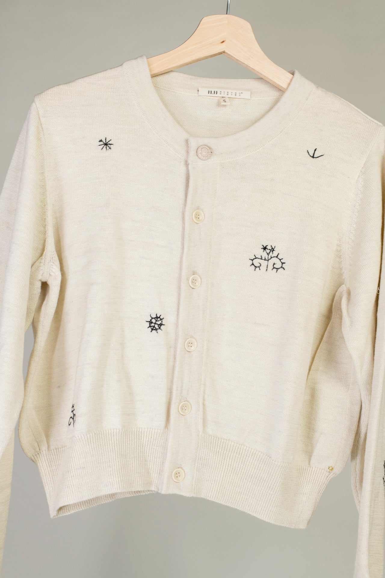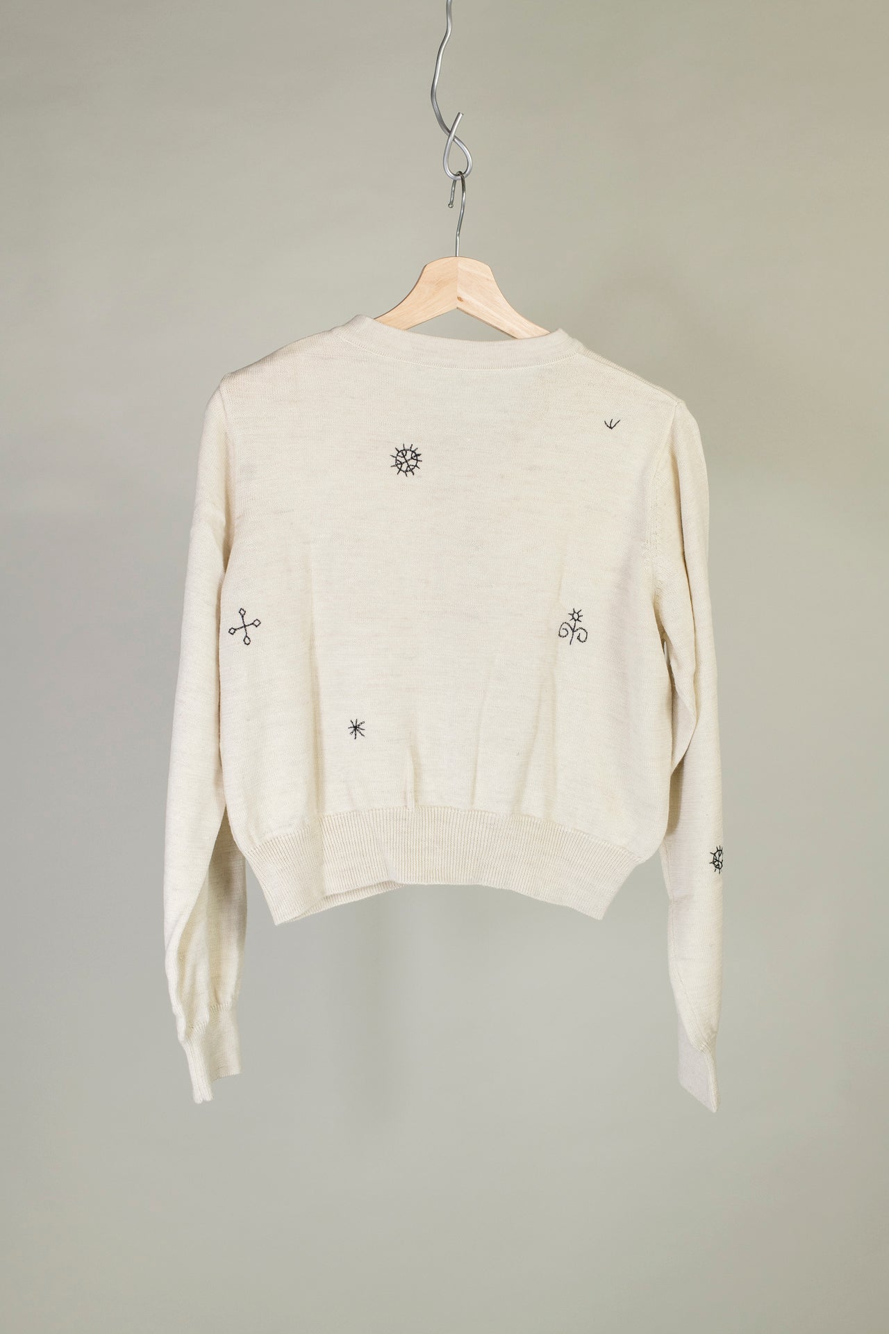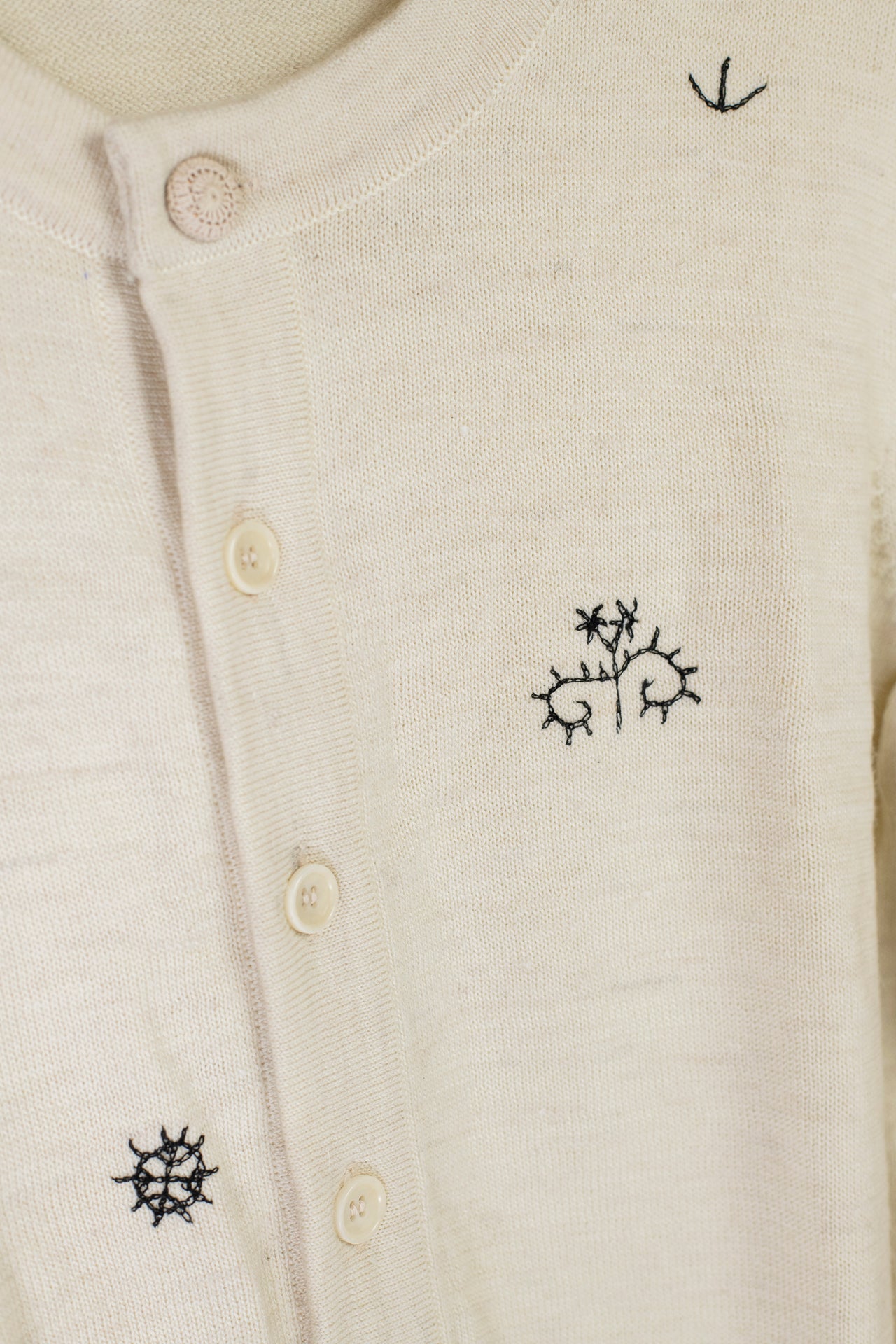 Handsewn pattern details around the sweater. Fabric covered top button detail