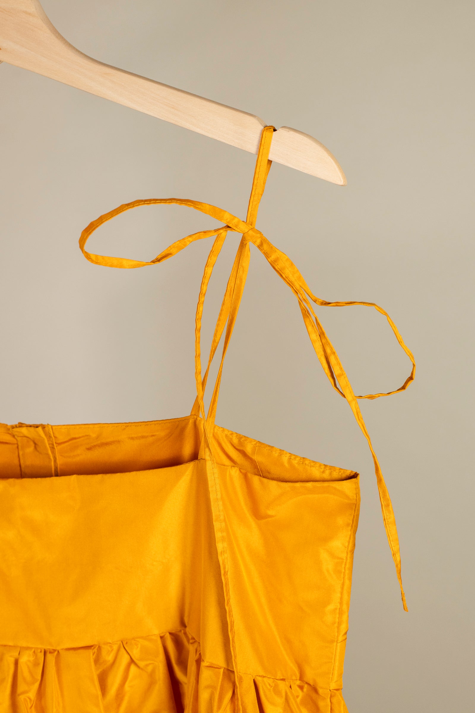 Made from luxurious vivid orange silk taffeta that keeps a beautiful shape while you walk, the fabric has an elegant sheen and whimsical volume. A modern heirloom.