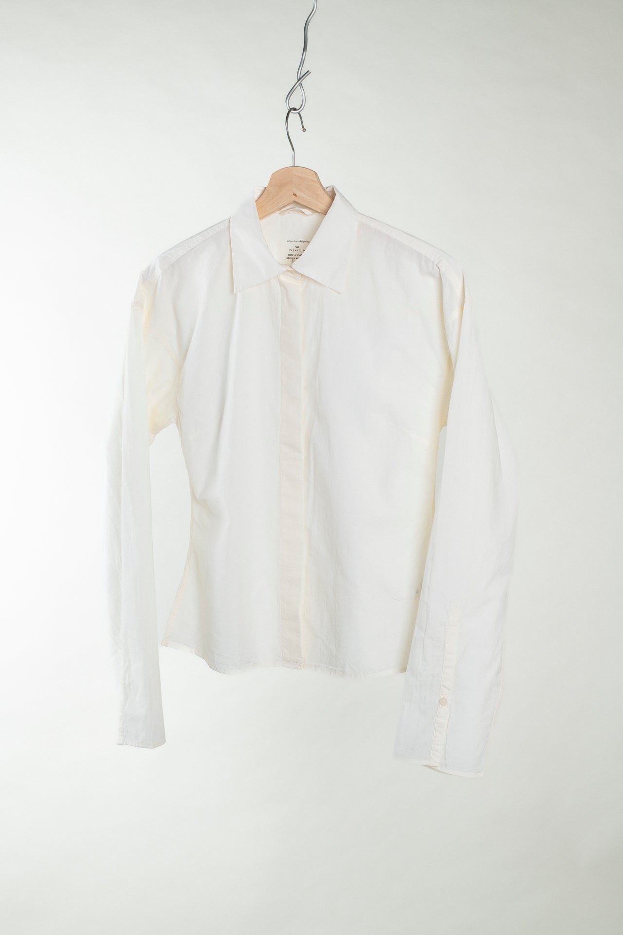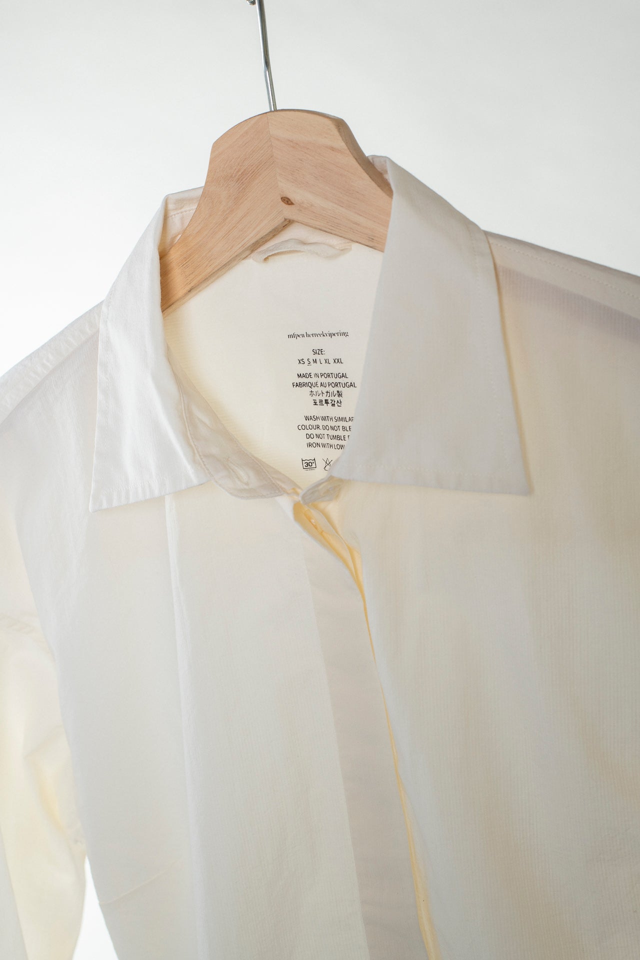 The Software Shirt has slim fit with drop shoulders and a straight hem. Featuring a spread collar, hidden button closure and sleeve openings without cuffs. Cut from a lightweight cotton with a dry hand feel and fine structured woven stripe in off white.