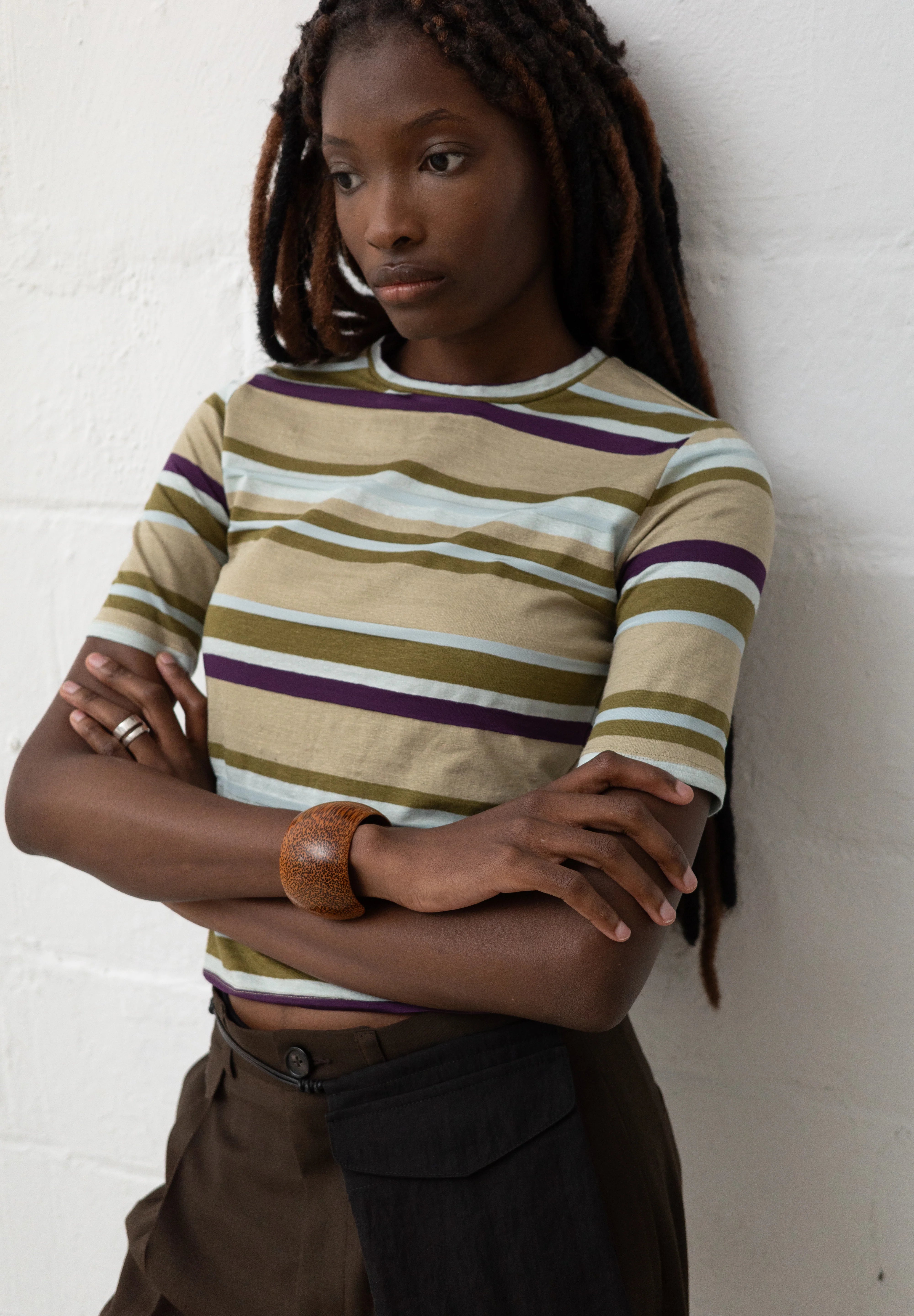 Simple in design, this fitted t-shirt emphasizes the stripe pattern. The sleeves end above the elbow, while the body is cropped to the low waist. A thin band finishes the neckline.