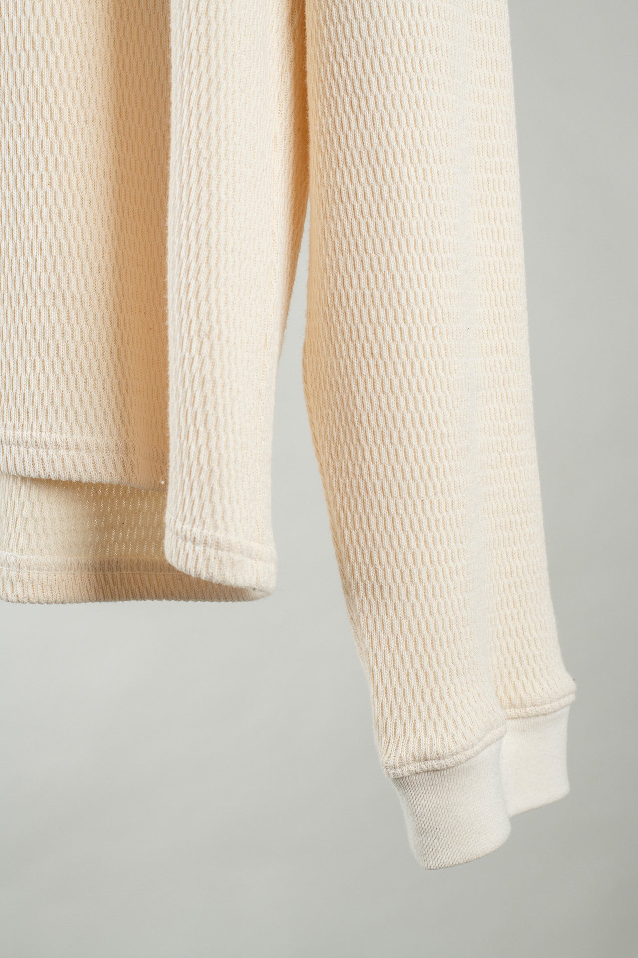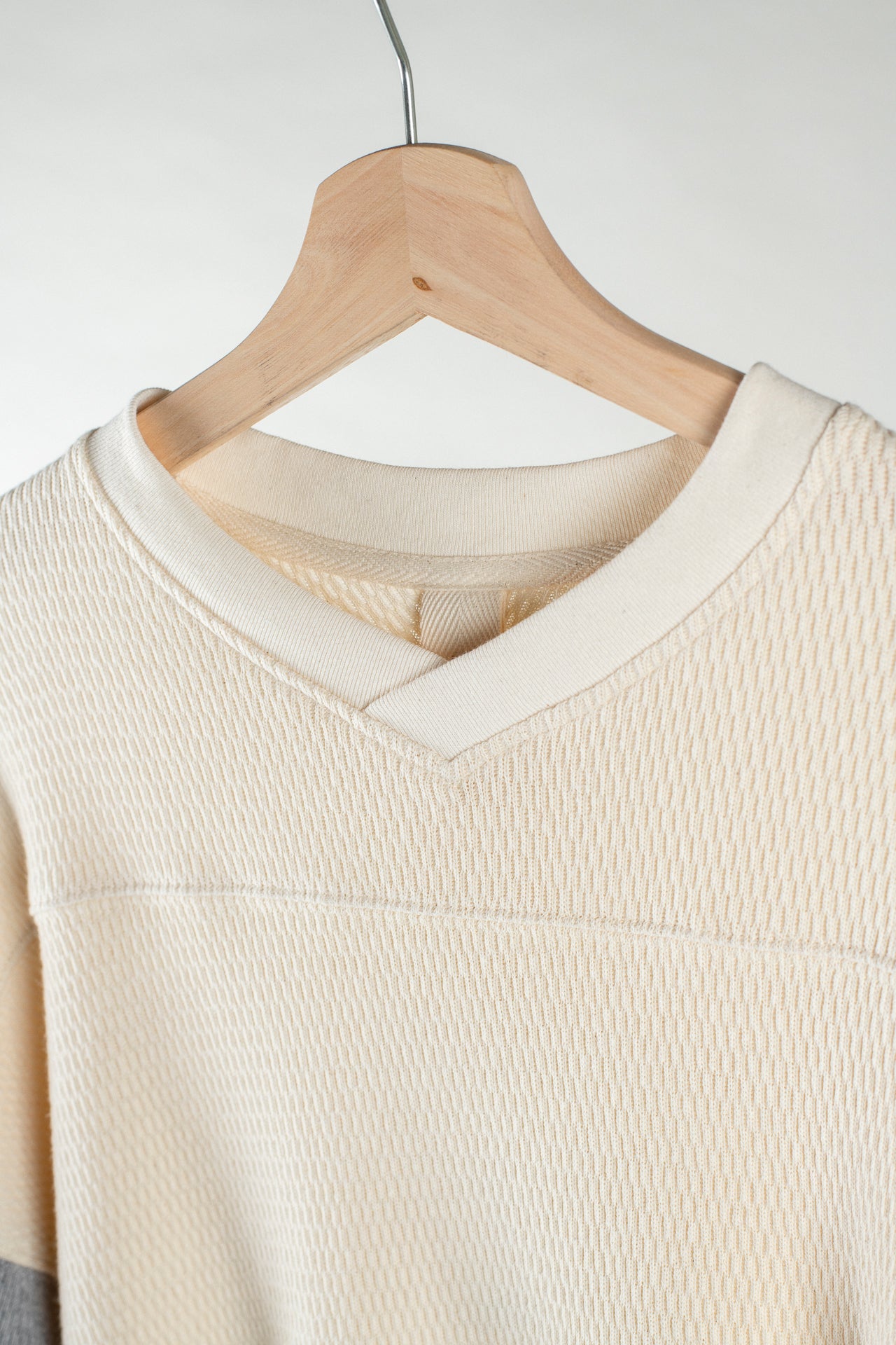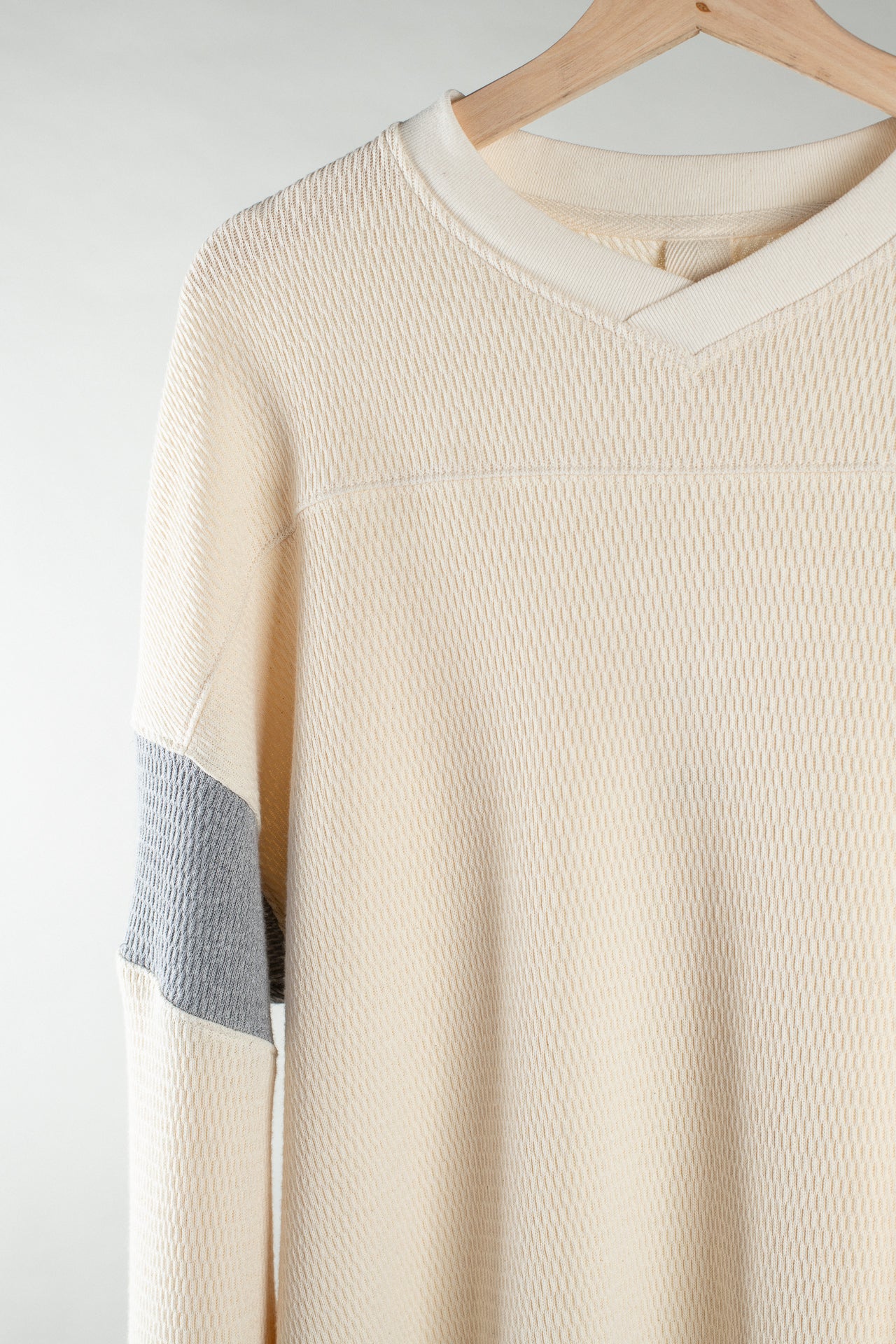 This hockey shirt is made to be a classic cotton thermal with patching and fit that brings that vintage hockey vibe. Tighter V-neck line, contrast grey arm bands. Cut to be a bit oversized, imagine throwing some shoulder pads on under while still being cool.