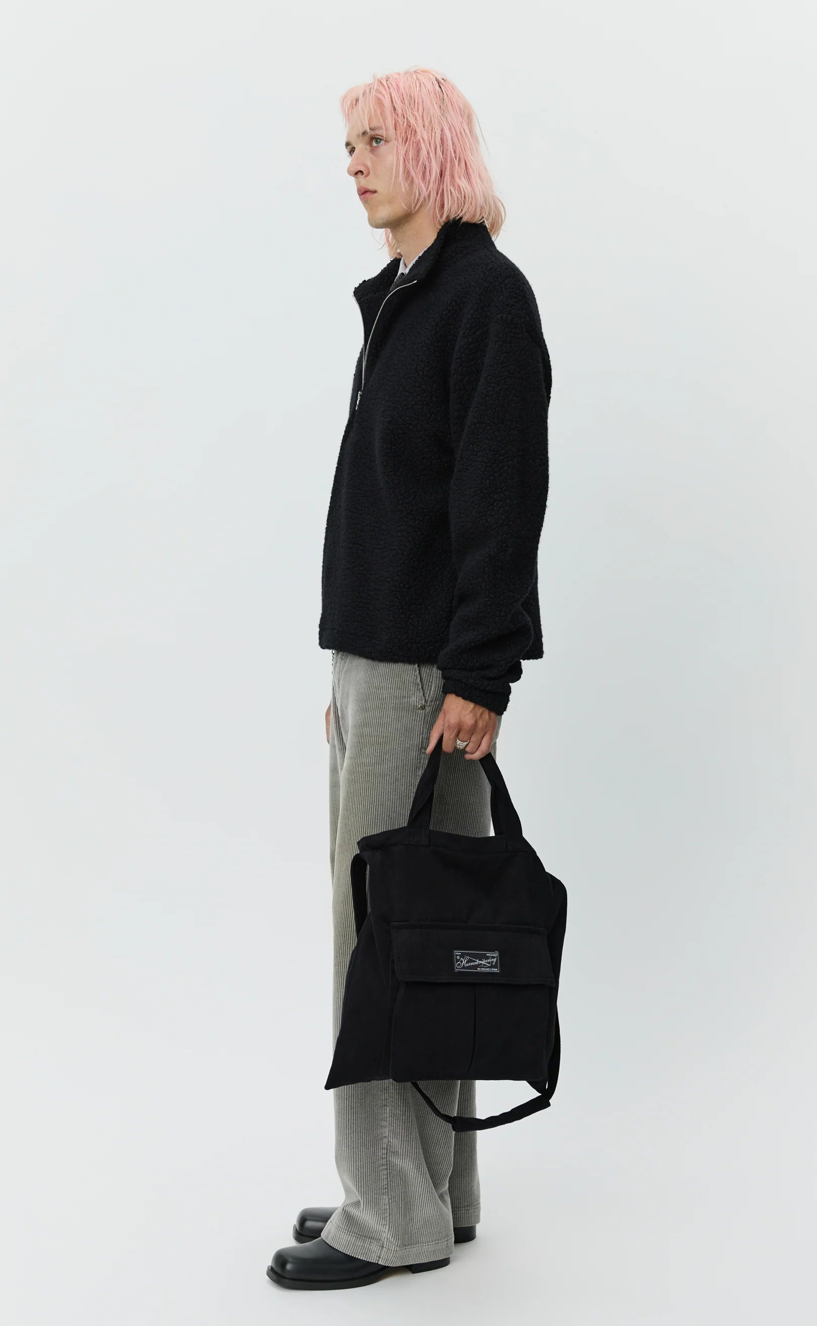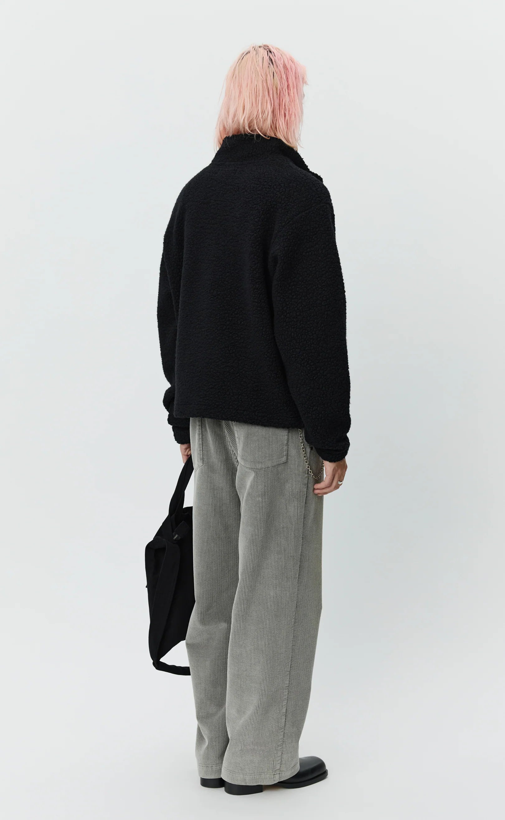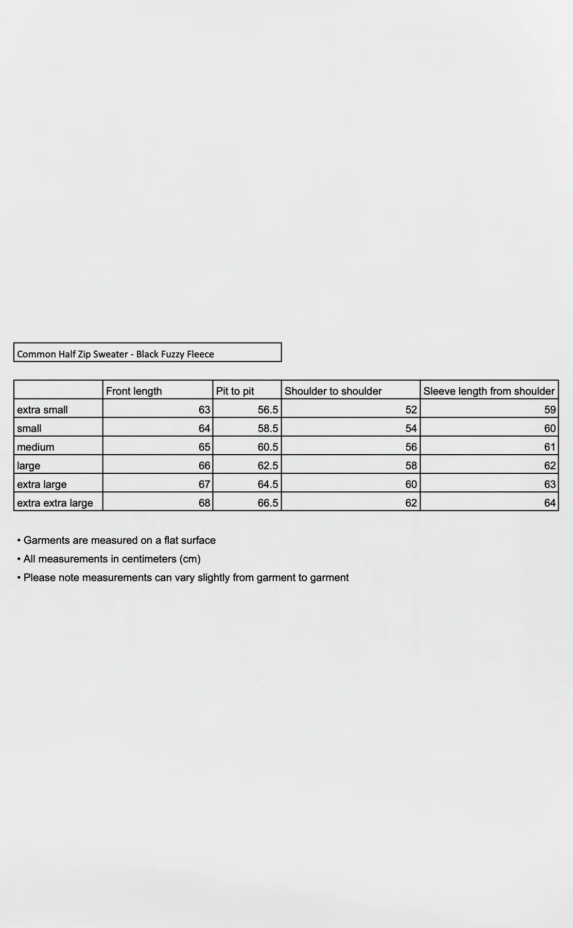 The Common Half Zip Sweater has a boxy, relaxed fit with dropped shoulders. Featuring a high stand collar with Riri zip closure and elasticated cuffs and hem. Cut from a soft, deep pile fleece in black knitted from recycled fibers.