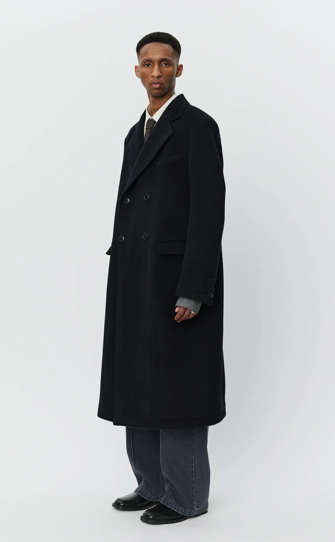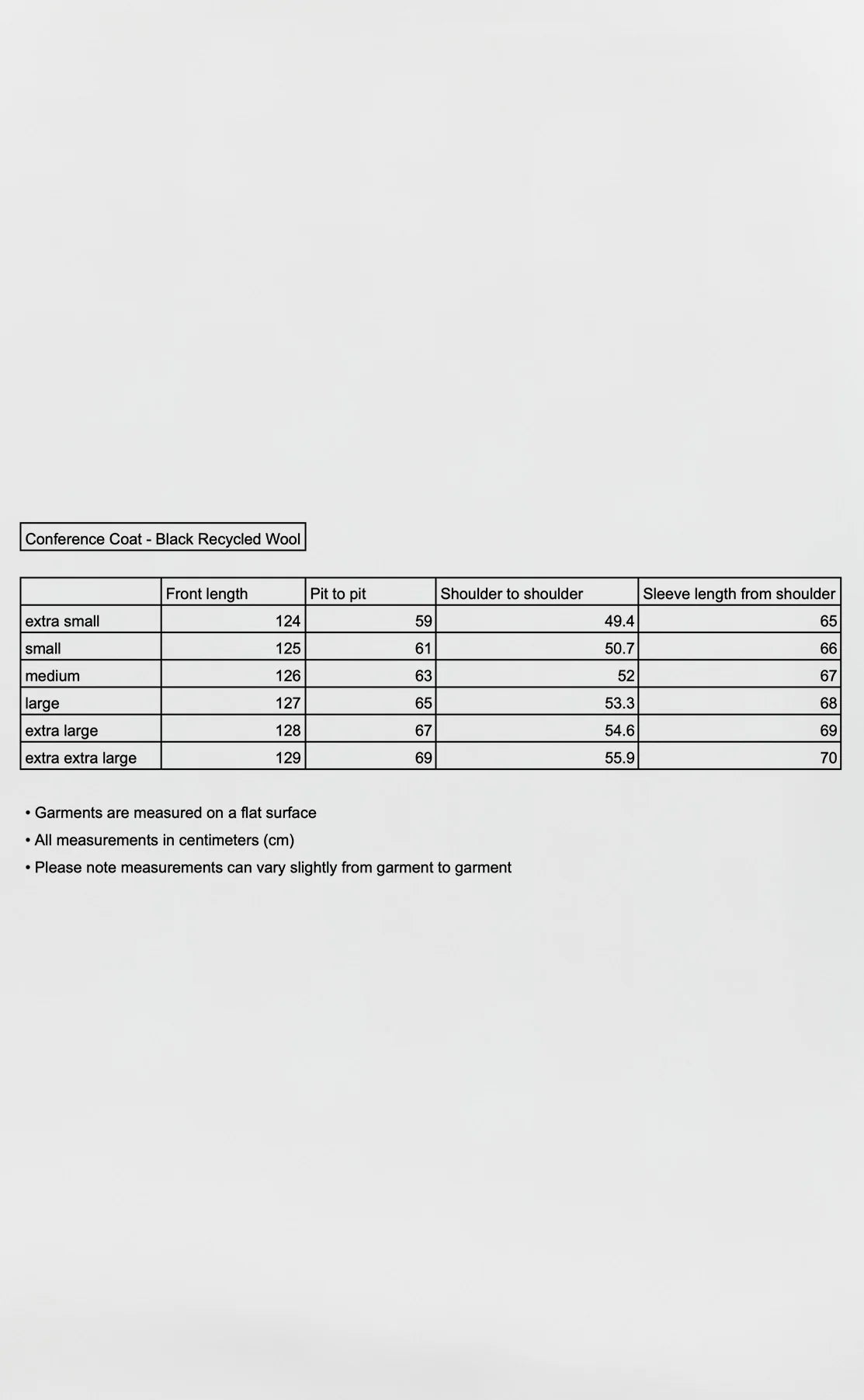 The Conference Coat is calf-length with a relaxed fit, full lining, and slightly slanted shoulders. It features notch lapels, side flap pockets, a welt chest pocket, an interior pocket, and a rear vent. Cut from post-consumer recycled melton wool in black.