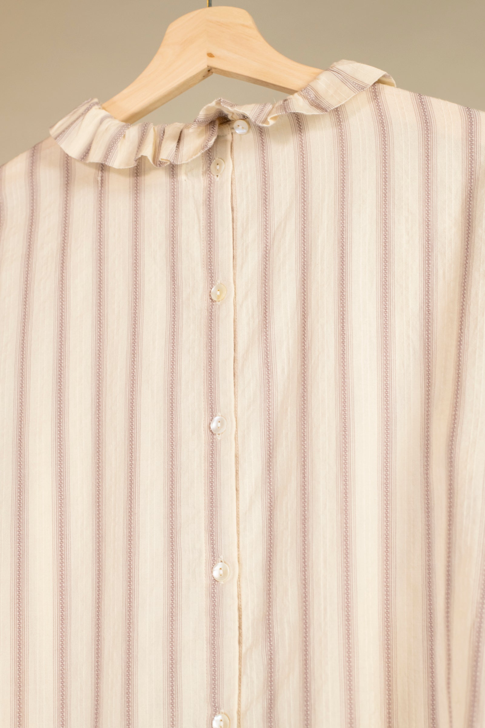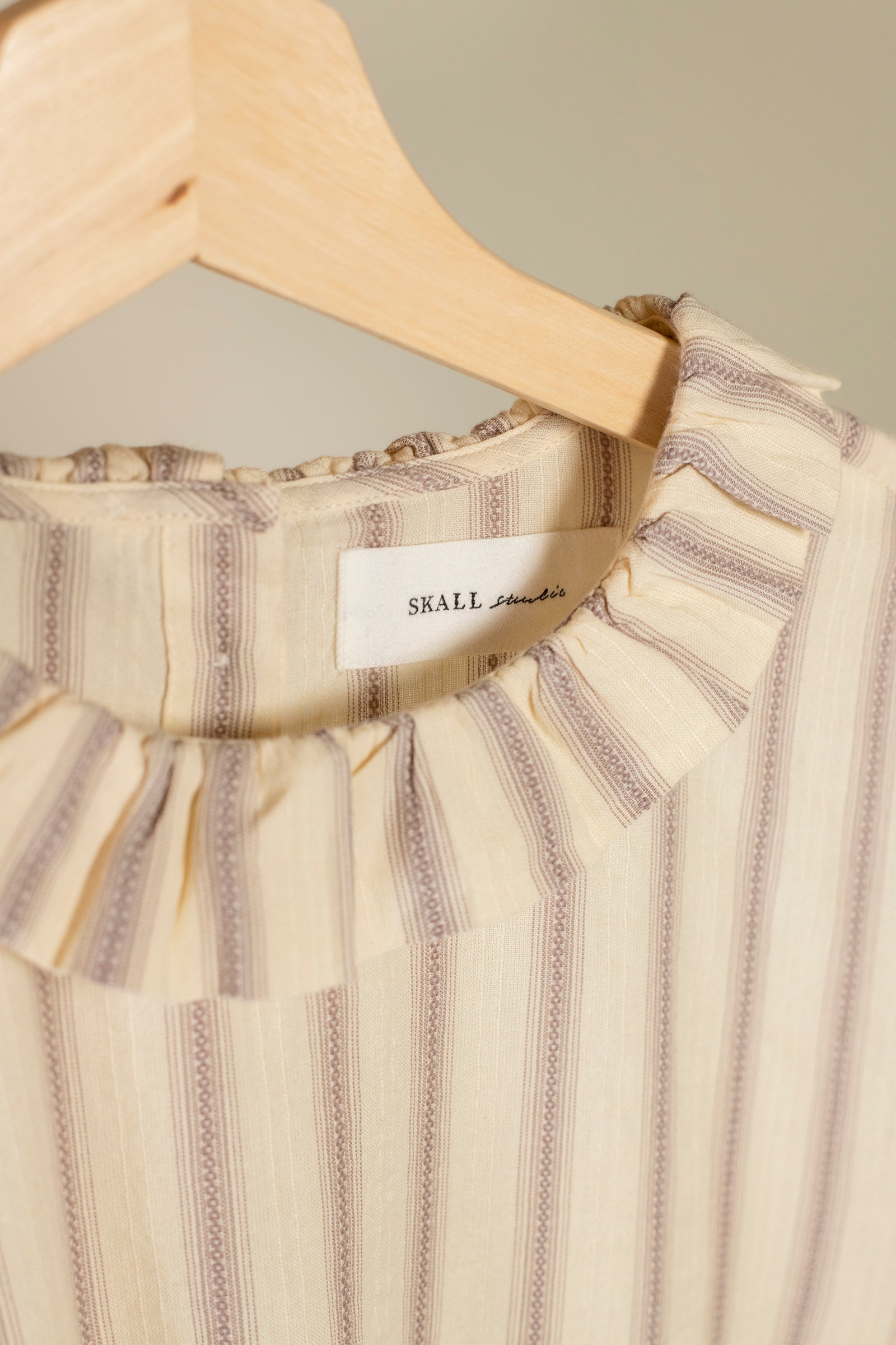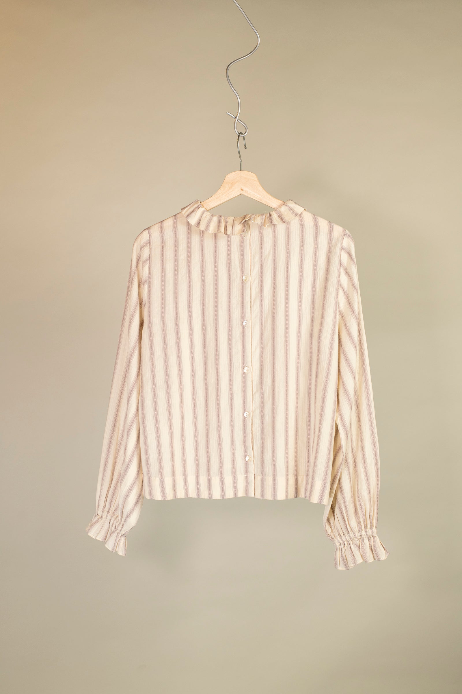 Cornflower blouse is a blouse made in organic cotton with a light structure. The blouse has a round neck with a small lace collar and closes all the way down the back with buttons. The sleeves have a bit of volume and are detailed with an elastic cuff with a lace trim.