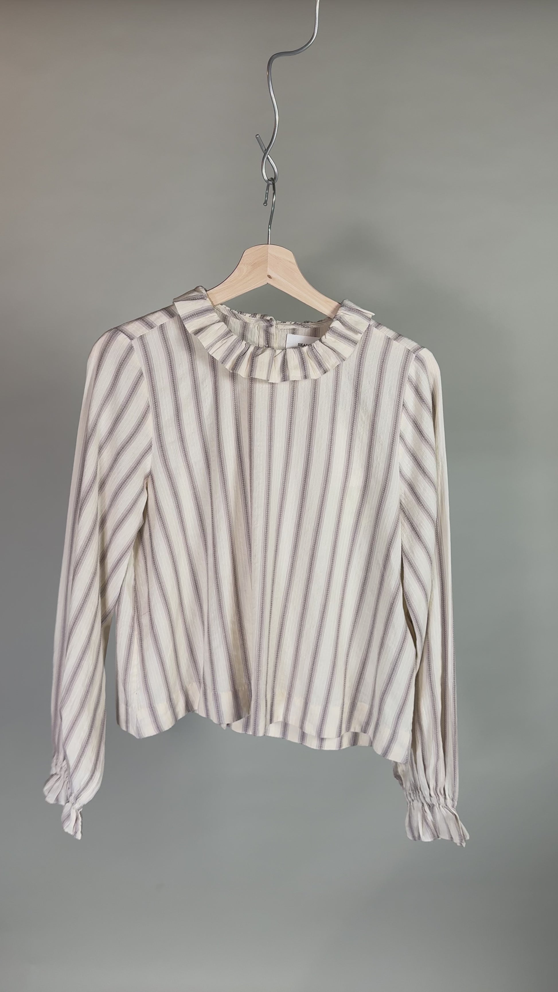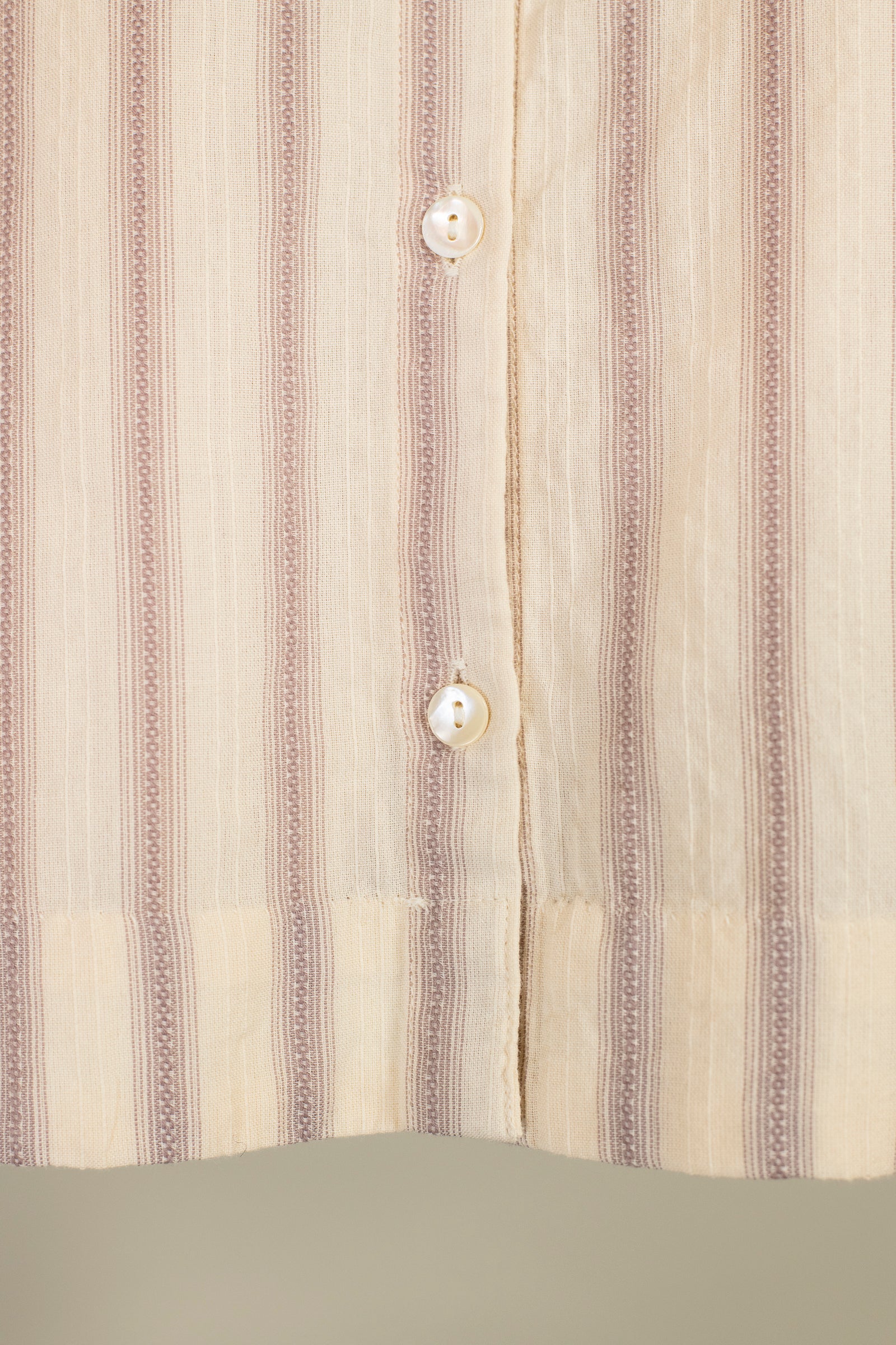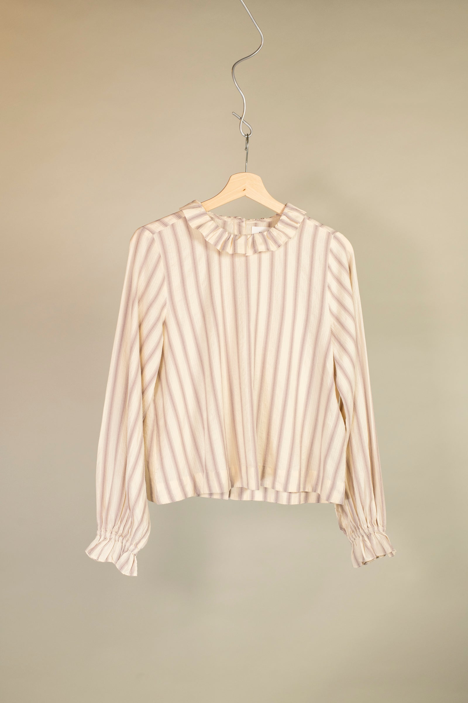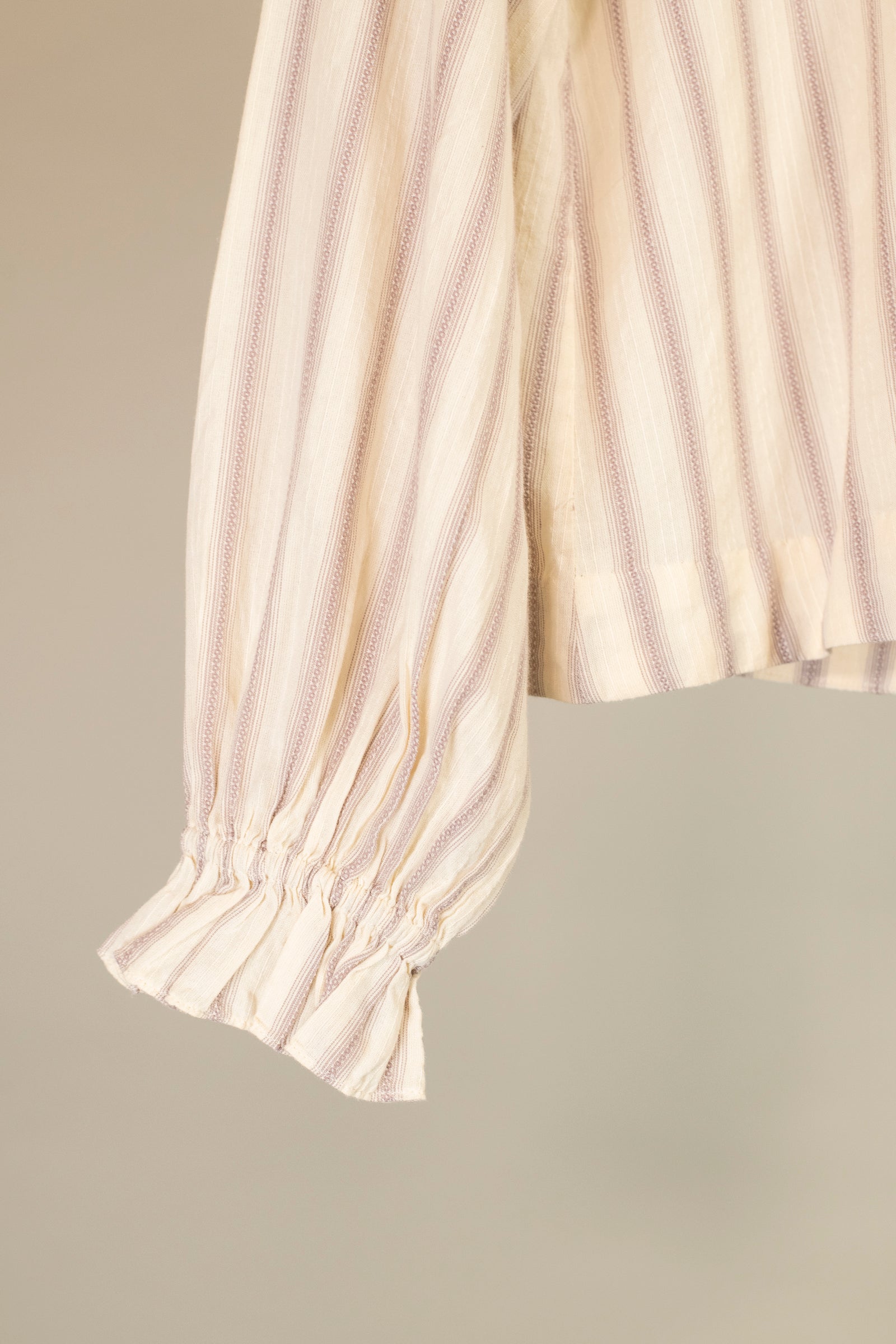Cornflower blouse is a blouse made in organic cotton with a light structure. The blouse has a round neck with a small lace collar and closes all the way down the back with buttons. The sleeves have a bit of volume and are detailed with an elastic cuff with a lace trim.