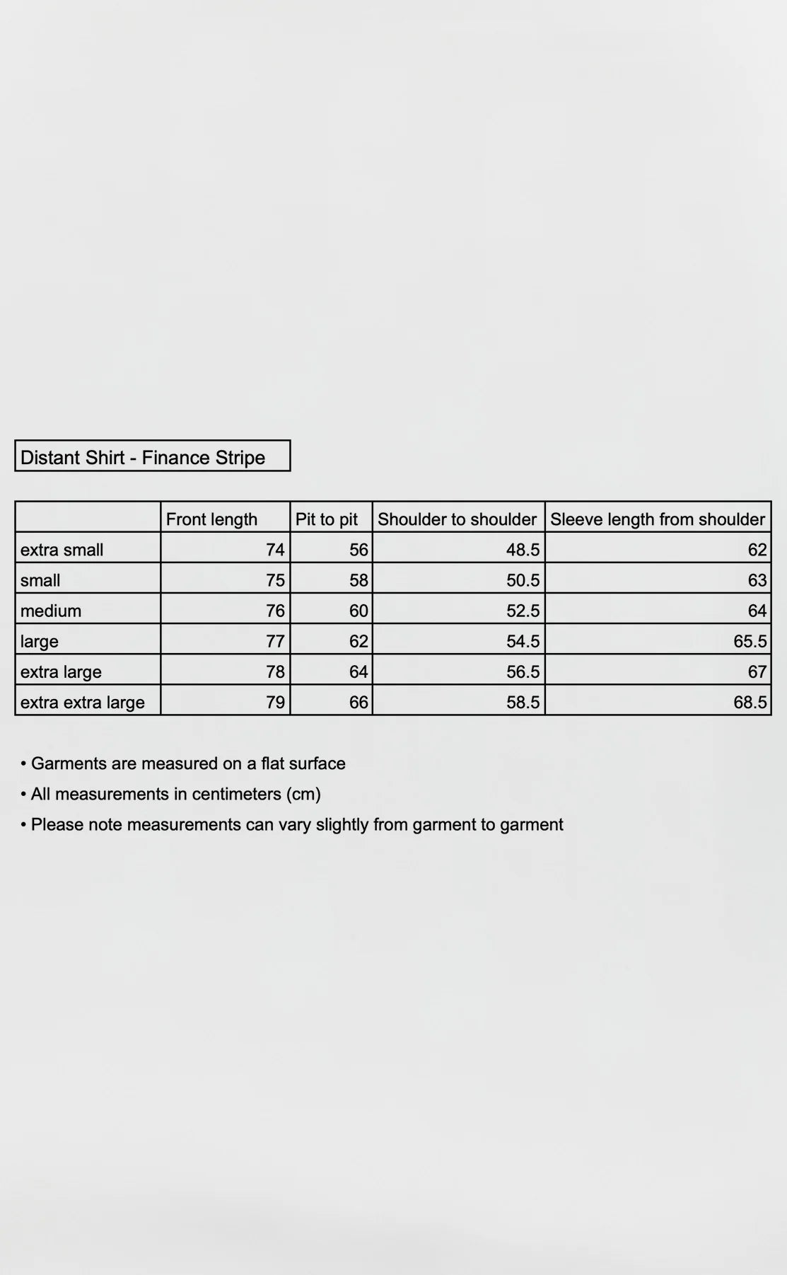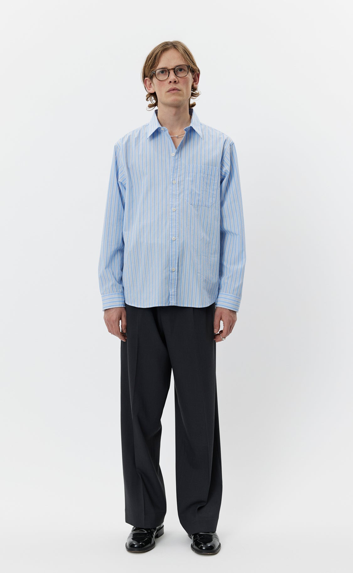 The Distant Shirt has a regular fit with a curved hem. Featuring button placket, spread collar, back yoke pleats and a chest pocket. Cut from a soft organic cotton with a navy and white multi stripe on a light blue ground.