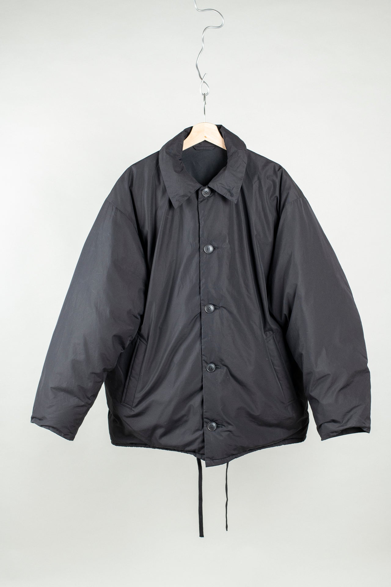 This down coach jacket delivers classic styling with a contemporary, relaxed fit. Generously cut to layer comfortably over any outfit, it features a drawcord hem for adjustable shaping and a stand-up collar for added protection against the elements. This jacket is oversized and volumous.