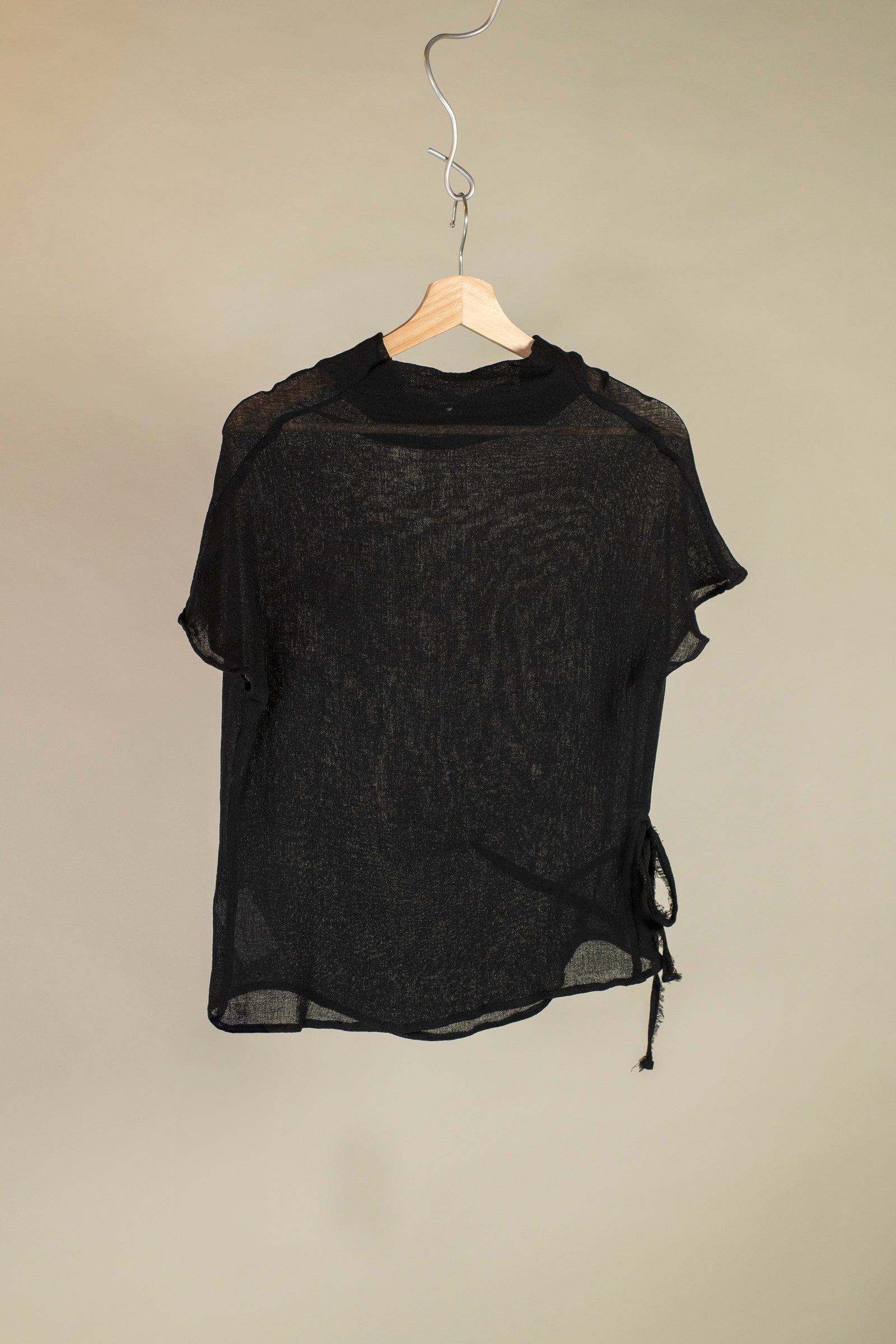 beautiful draping neck short sleeve top, with right side tie with raw edges for a beautiful finish.