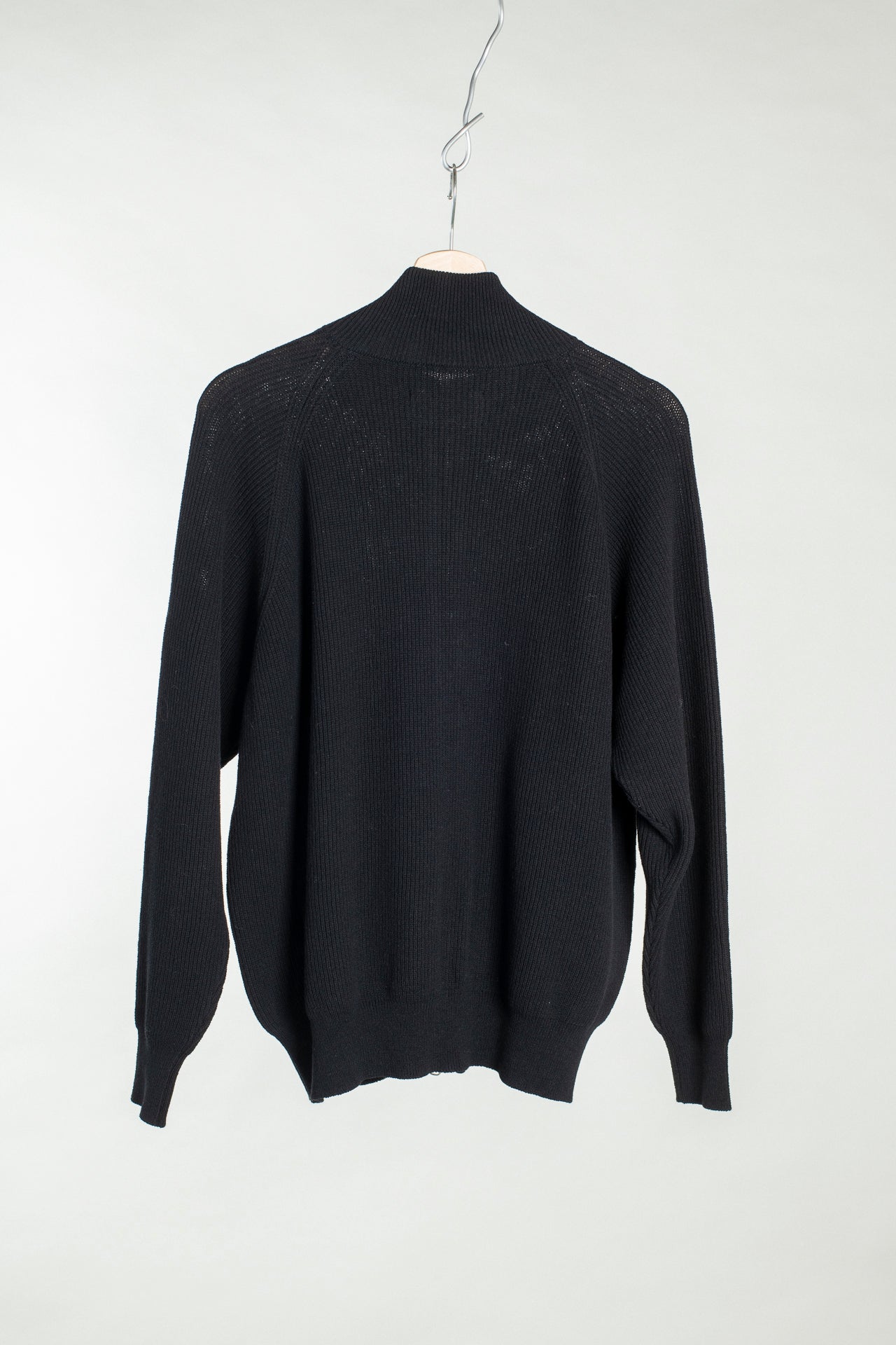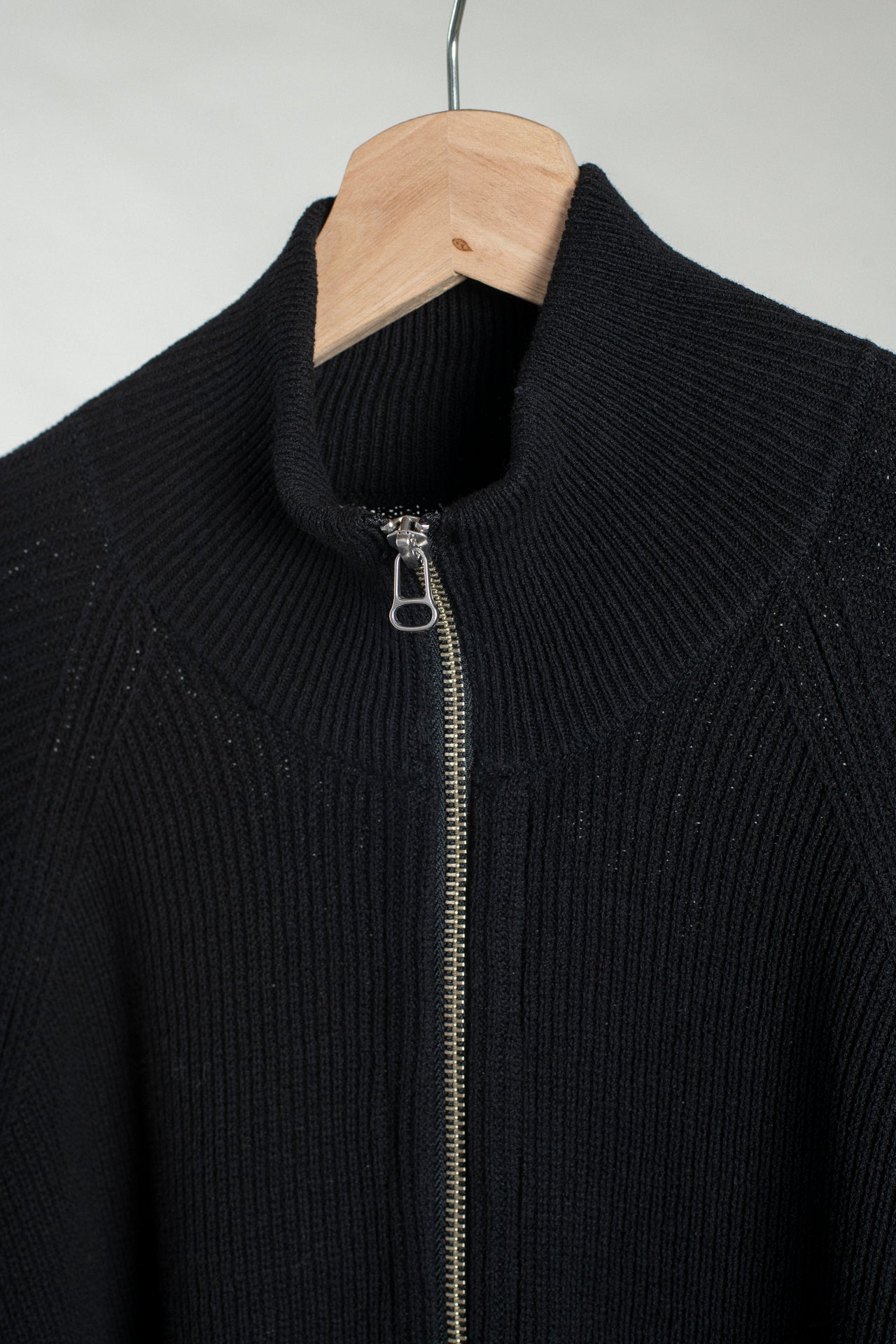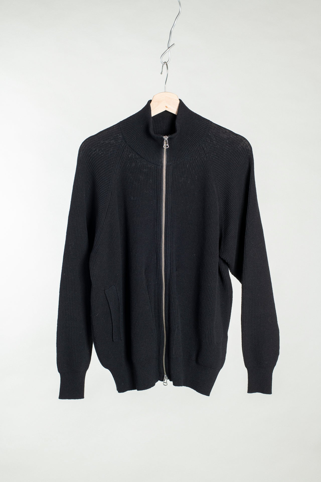 A sturdy two way zipper and a high mock neck. This piece fits close to the body with a bit of volume in the sleeves, with natural stretch to the fabric for movement.