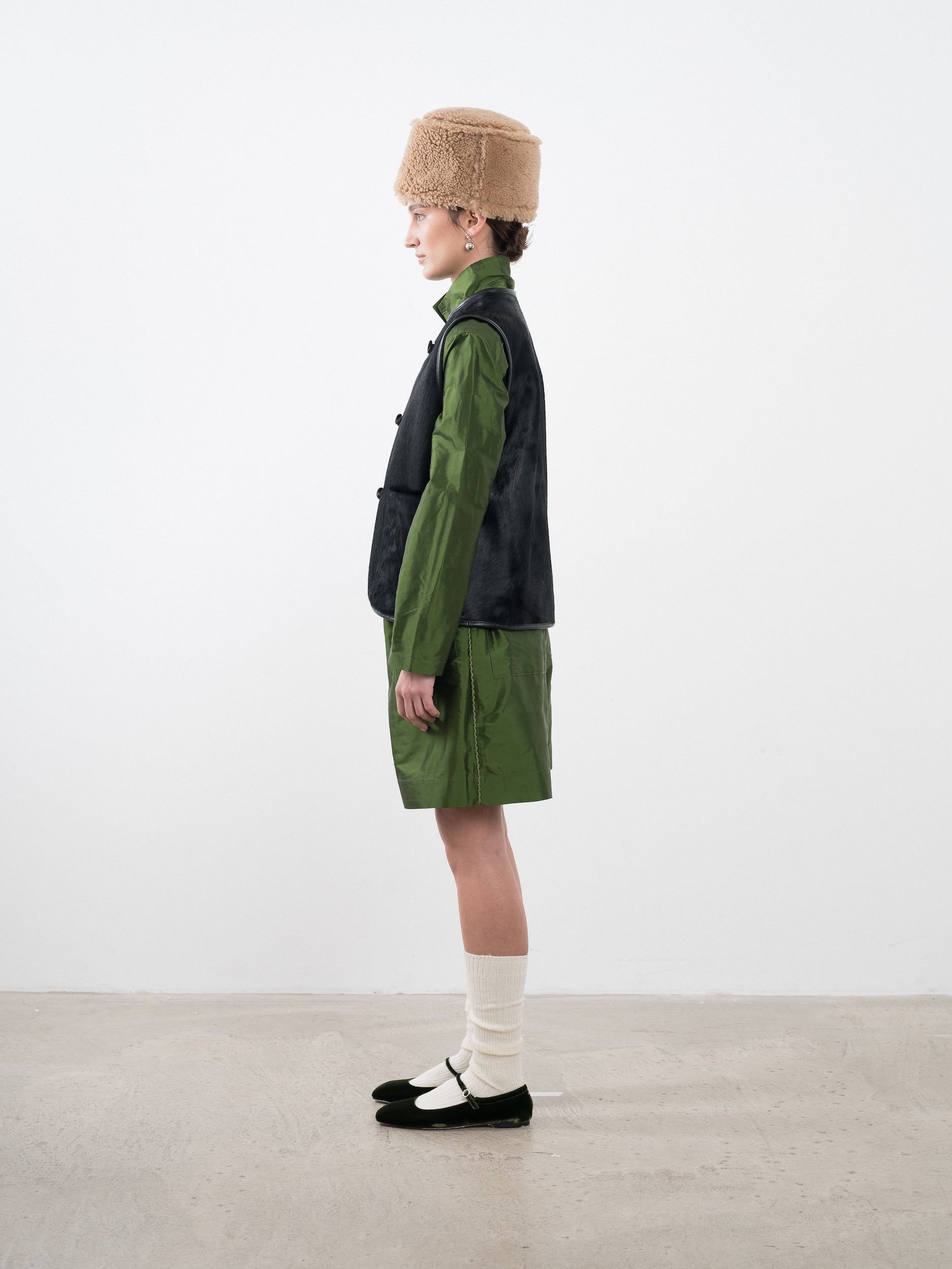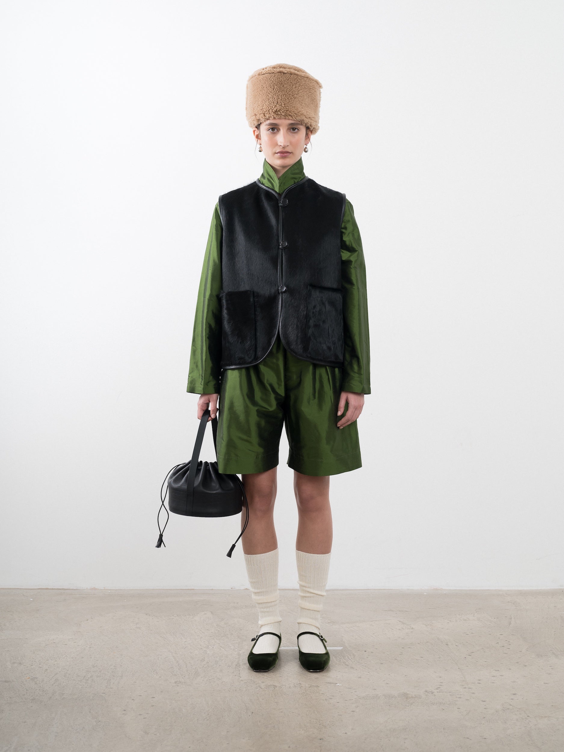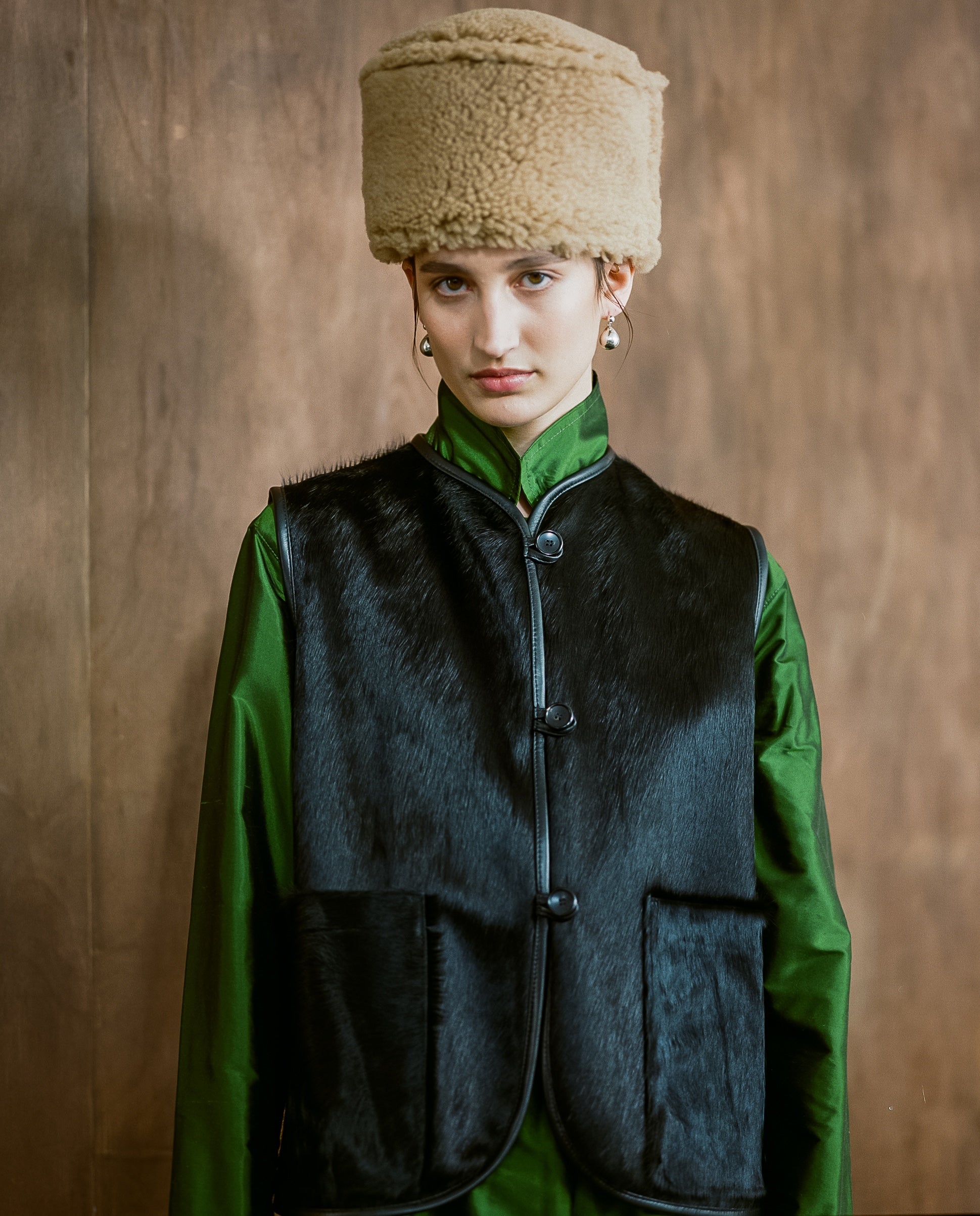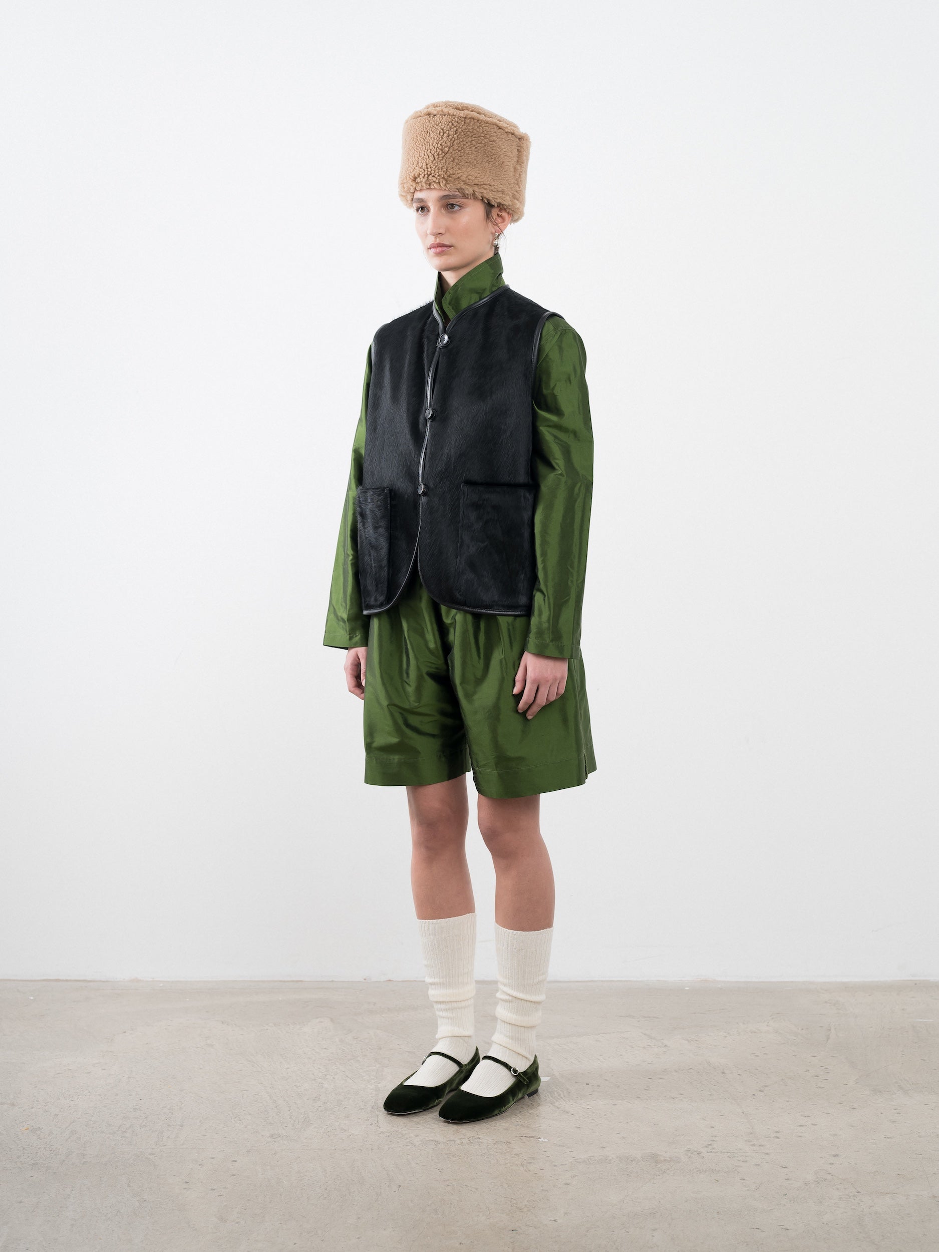 Made from a unique hair on leather, with a tactile and shiny effect, the Ella vest has two front patch pockets and a button and loop closure.
