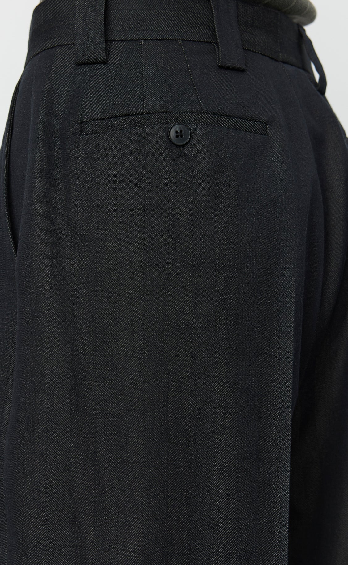 The Favorite Trousers have a wide straight fit with double pleats and a mid-rise. Featuring side pockets, rear welt pockets, button closure, hook-and-eye closure and YKK zip fly. Cut from a wide striped herringbone cotton and wool blend with a slight sheen, in a twill solaro weave of black and beige yarn. The weave is beautiful upclose, and provides a beautiful structure.