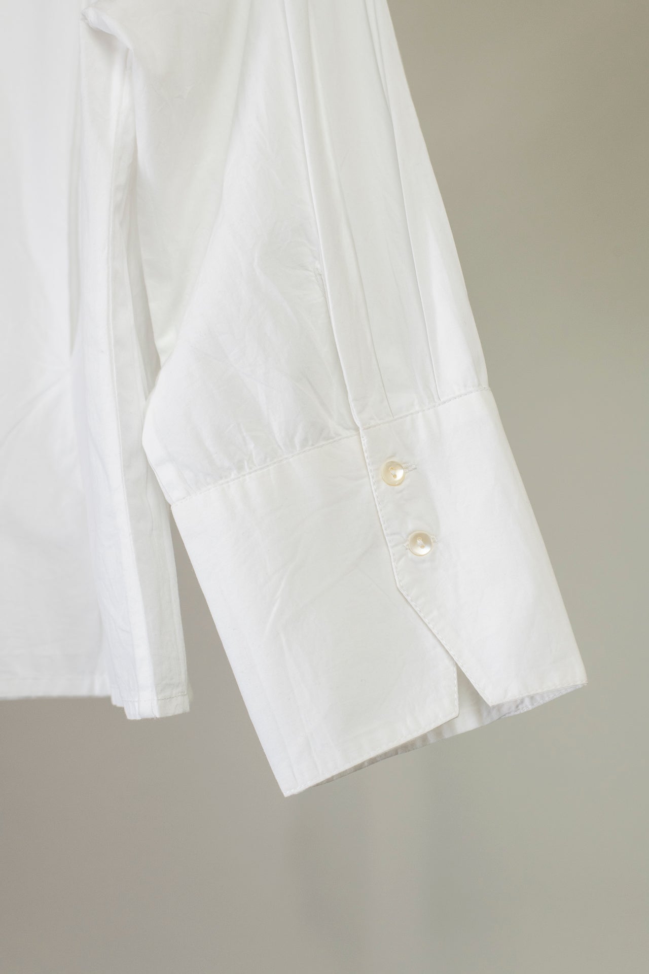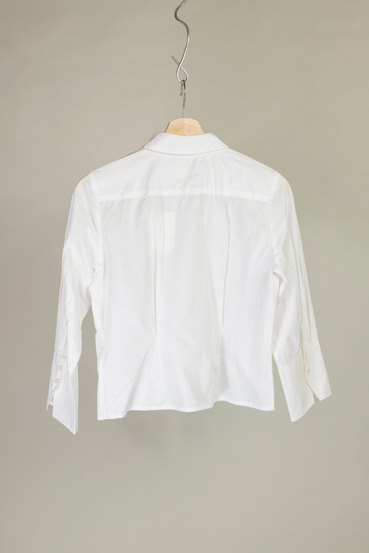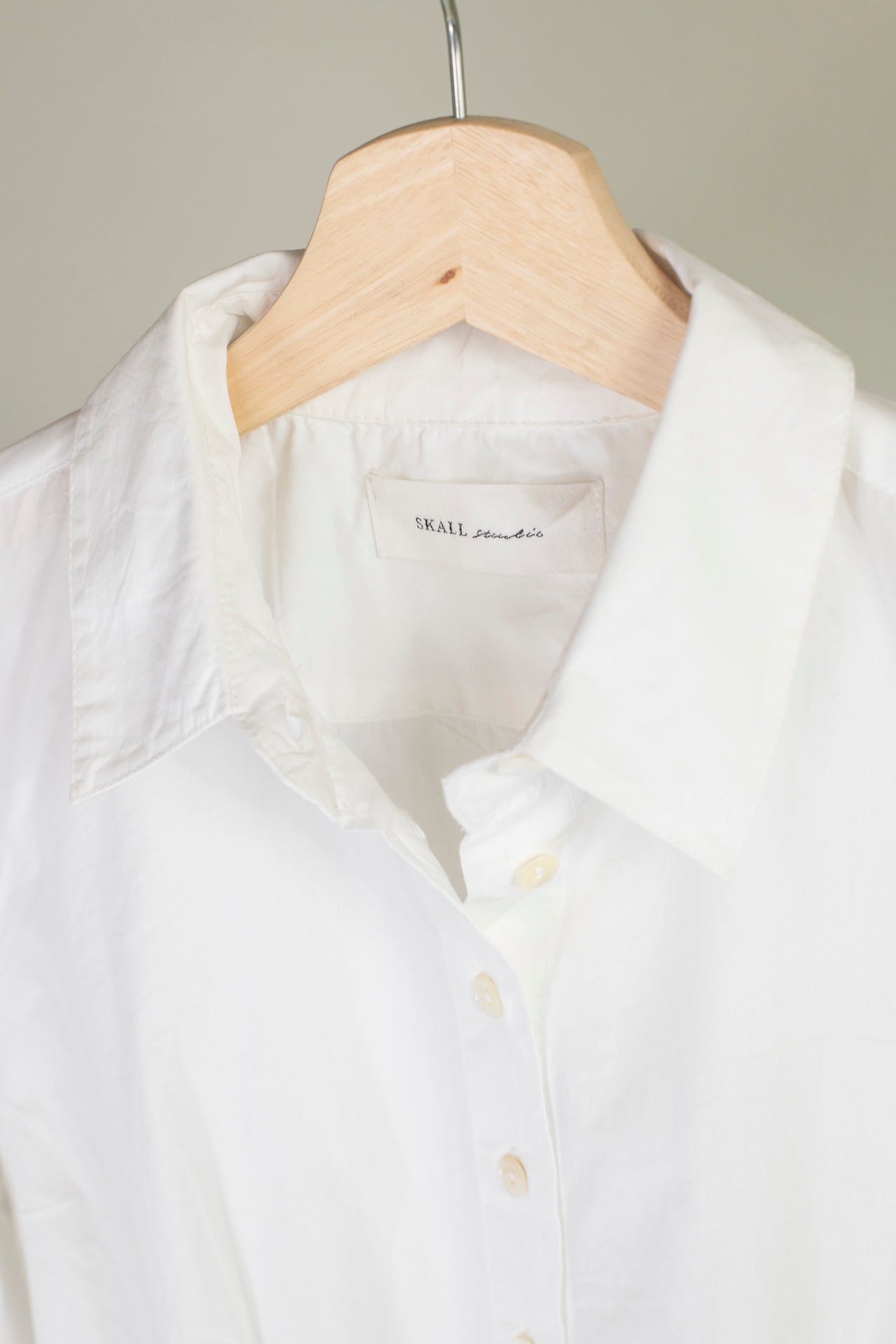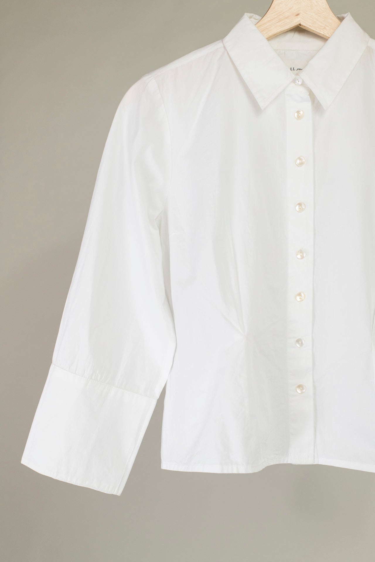 The Flair Shirt is an elegant, slightly cropped shirt made from organic cotton. The shirt has a regular collar, three-quarter sleeves with wide cuffs, and mother of pearl buttons. Additionally it has tailored details such as pintucks to create a more refined silhouette.