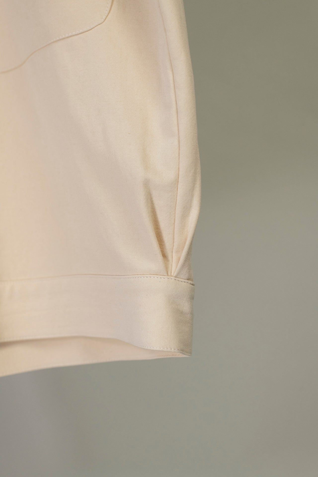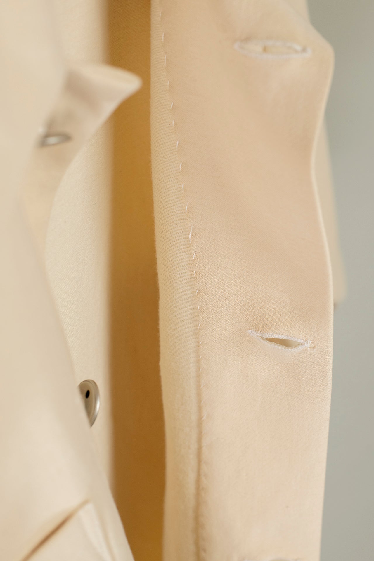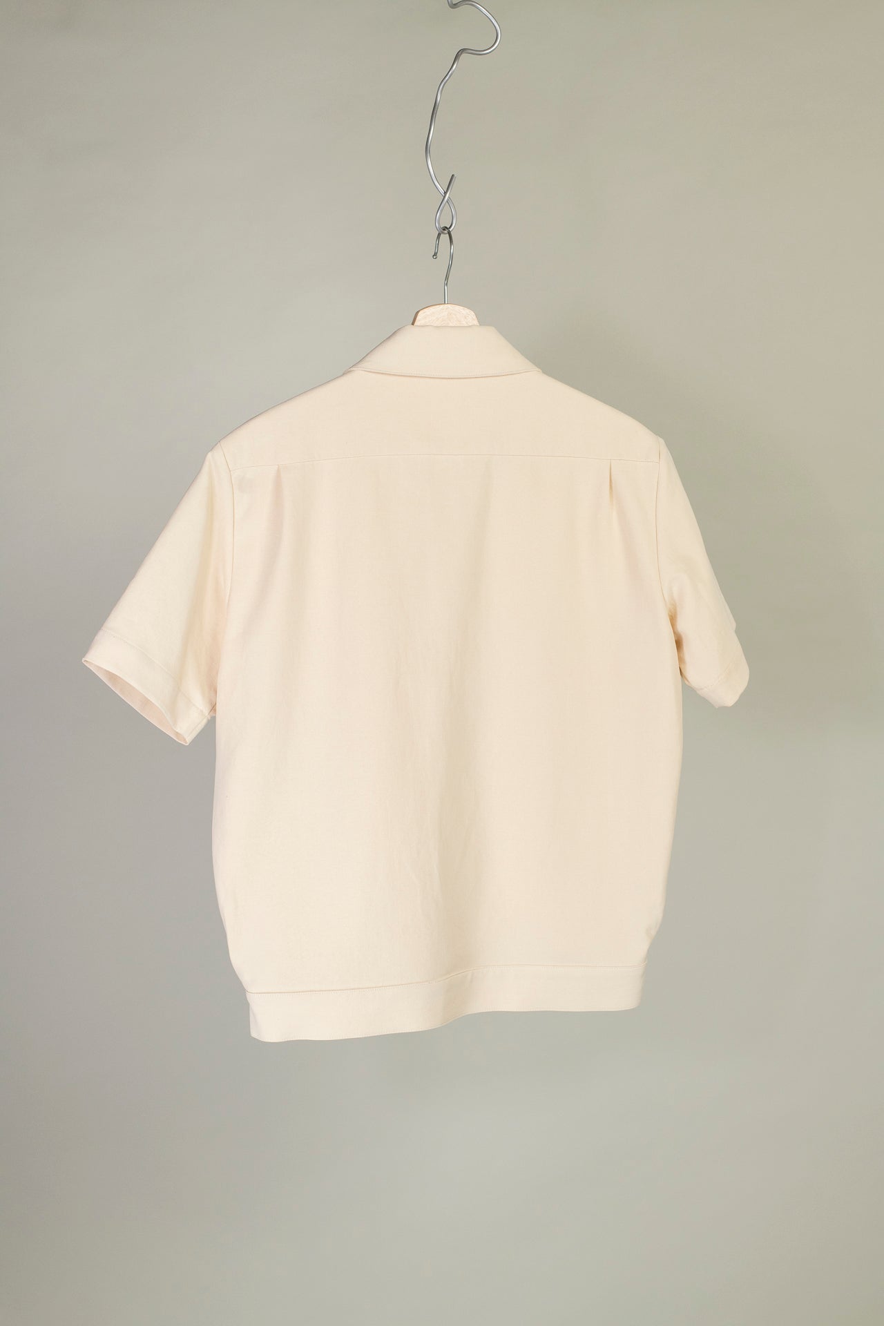 This cotton/ angora wool mix is in a natural colour. The cotton provides some stiffness, making it seem structured, while the wool gives a body and softness. This shirt can work dressed up or worn quite casually.