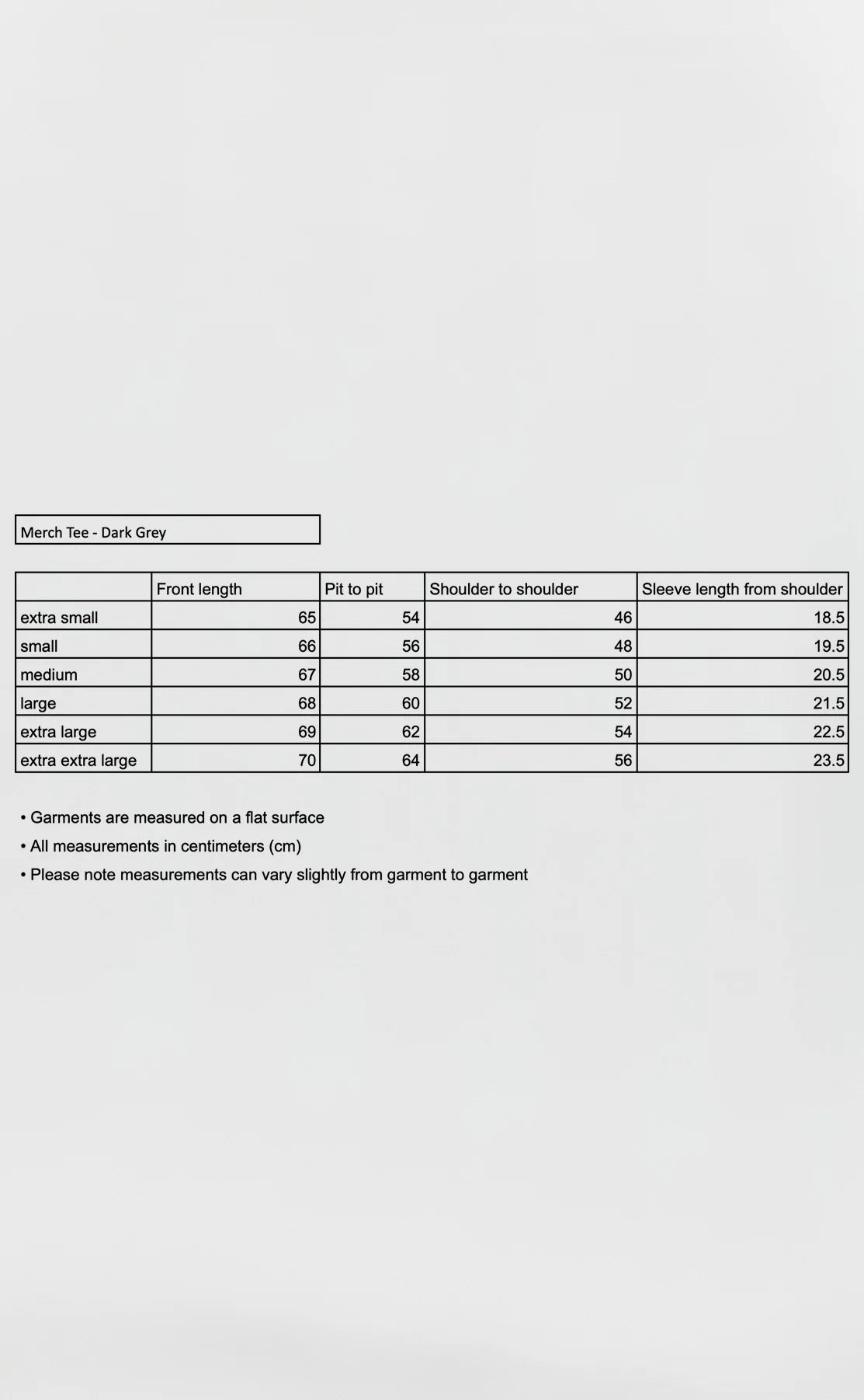 The Merch Tee has a boxy fit with a slightly cropped silhouette. Featuring fear print at centre front and ribbed crewneck collar. Cut from a garment dyed organic cotton jersey with a brushed surface in dark grey.