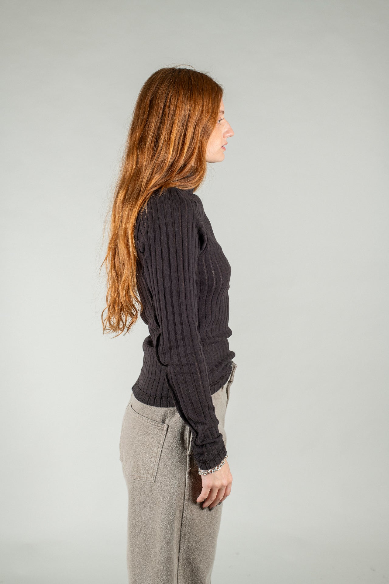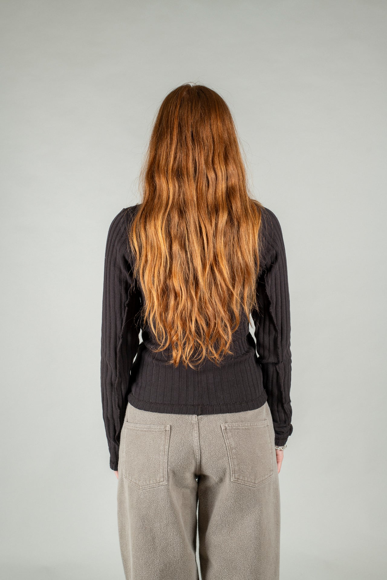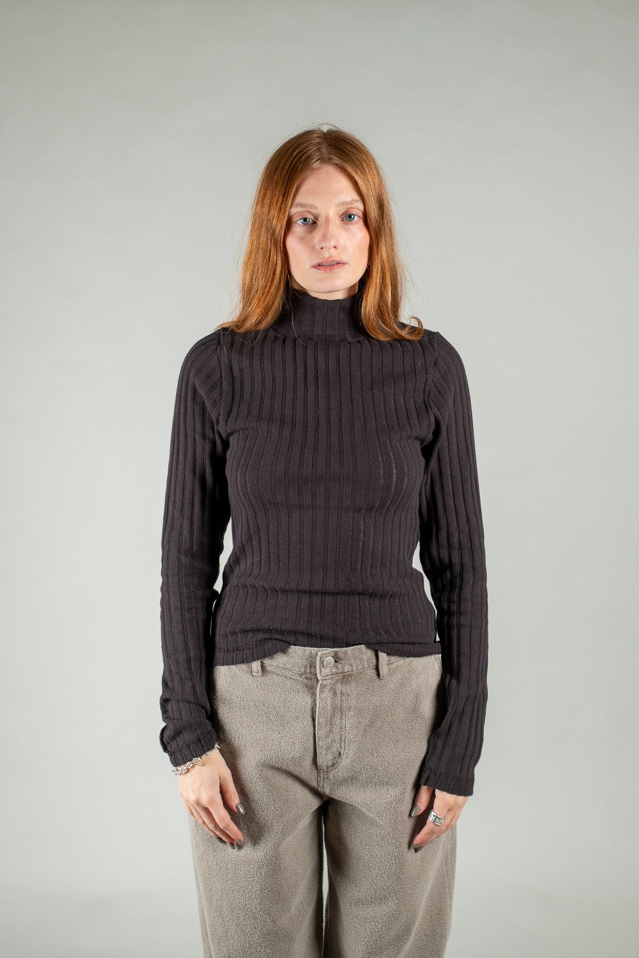 The Mock Neck has a slim fit with a high neckline and raw-edge finishing. Made with reverse flatlock seams on the sleeves and an overlocked seam down the centre of the back. Cut from a dark brown cotton blend in a 4x2 rib ajour knit, with vertical striping and semi-sheer ladder structure.