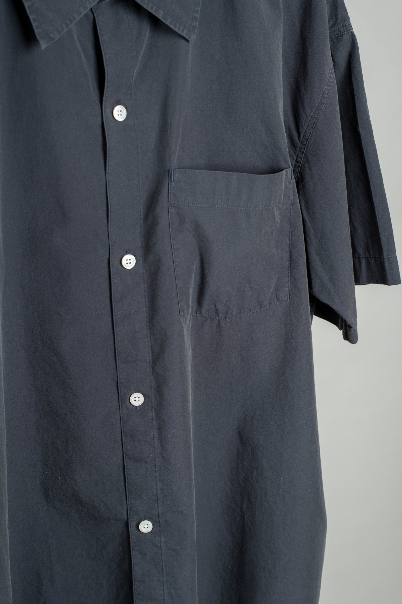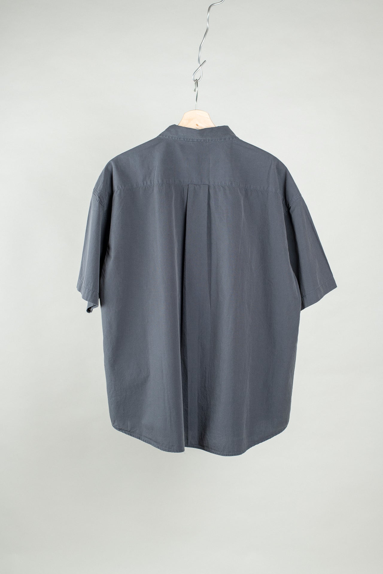 The New Input Shirt has a relaxed fit with short sleeves, drop shoulders and a curved hem. Made with button placket, spread collar, back yoke pleats and a chest pocket. Cut from a garment washed organic cotton in dark grey.
