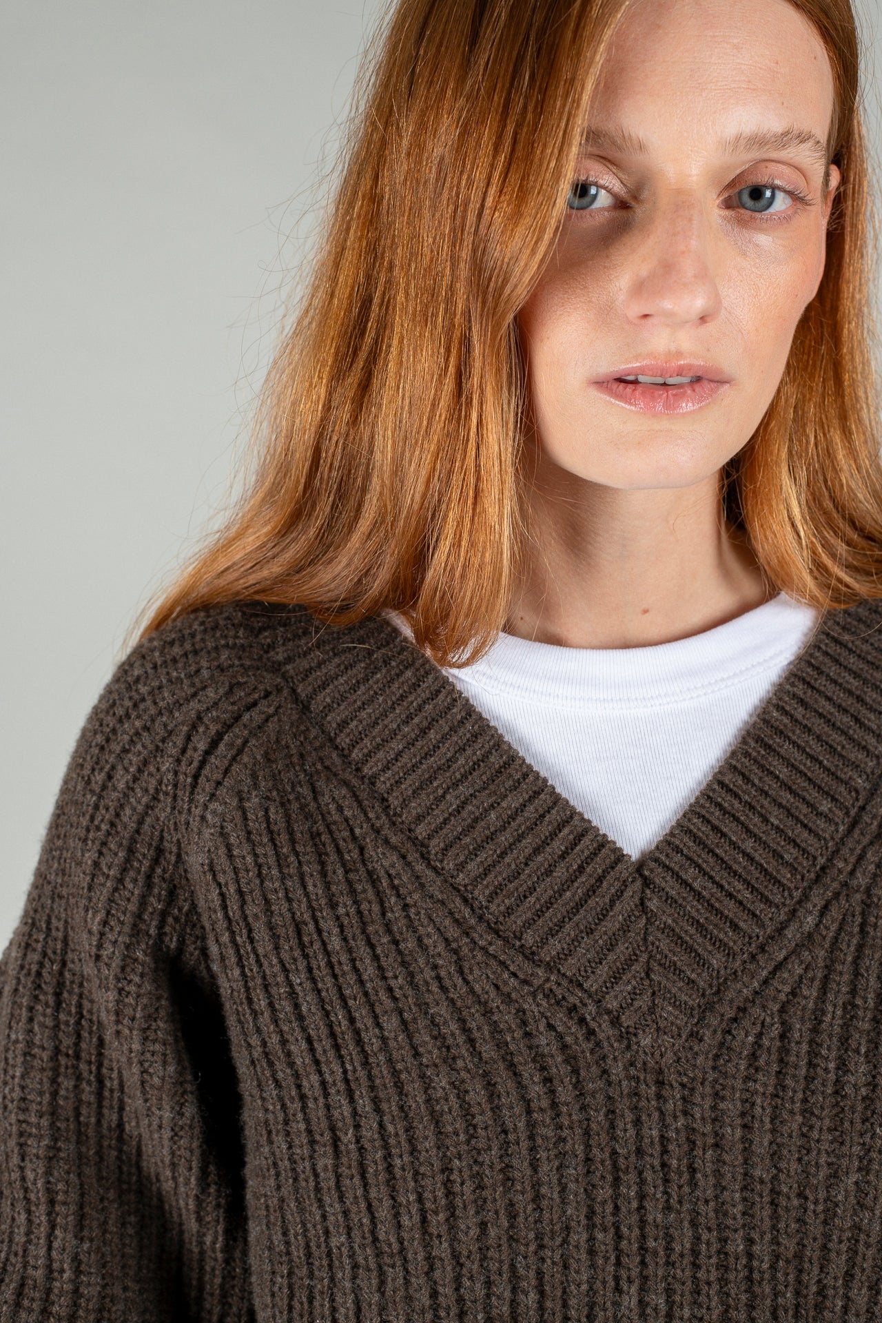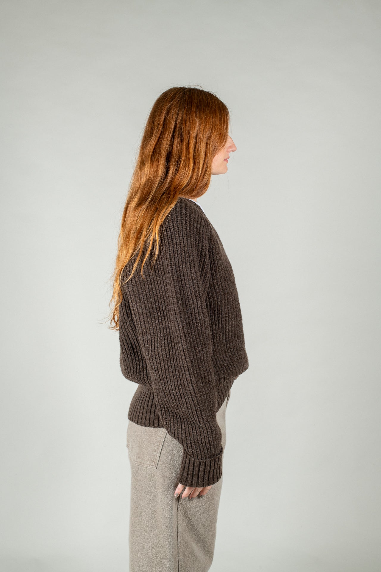 The Plaza V-Neck has a relaxed fit with raglan sleeves. Knitted from a soft dark brown wool, with a 1x1 rib throughout and finished with 2x2 rib at collar, hem and cuffs.