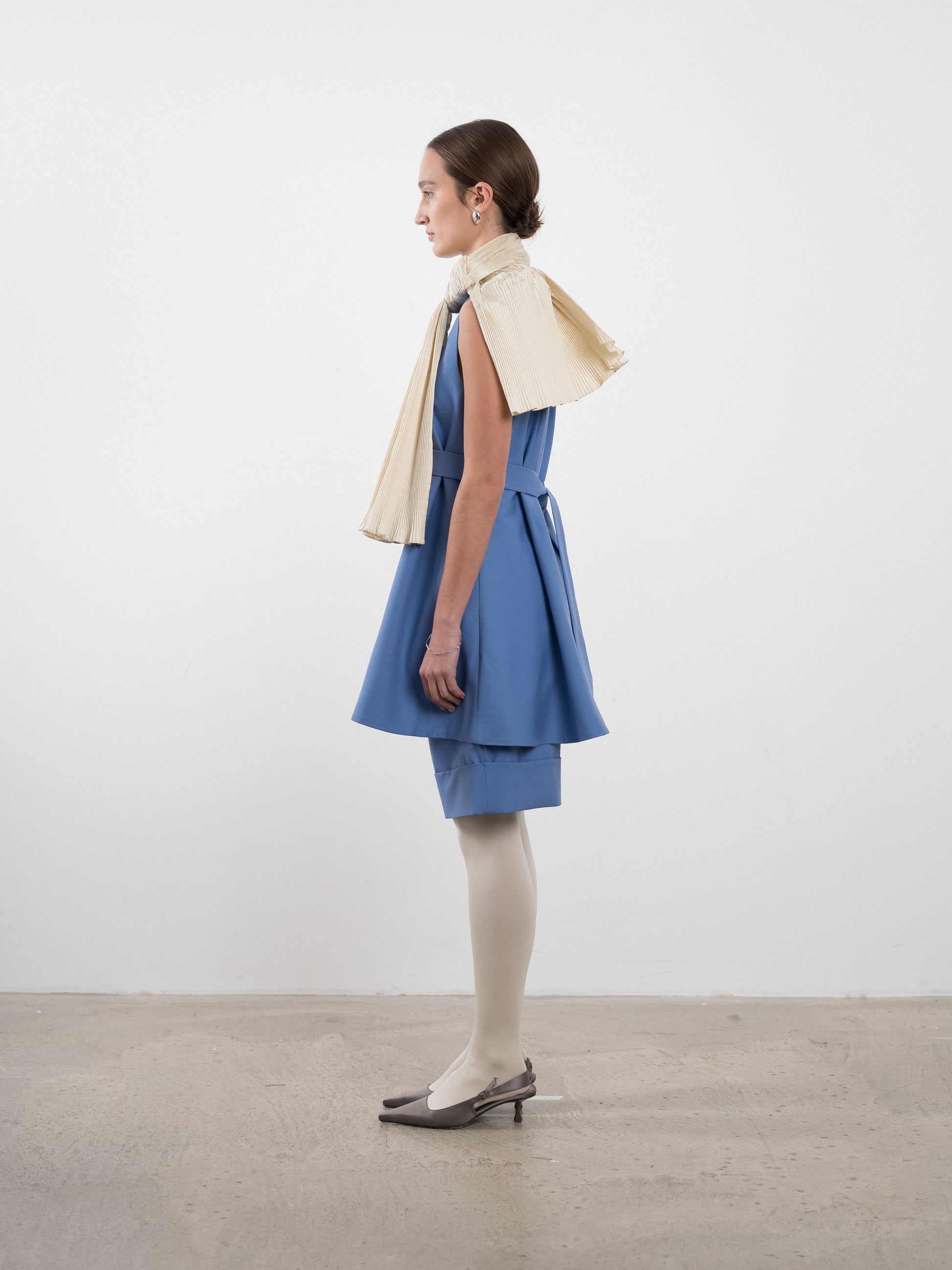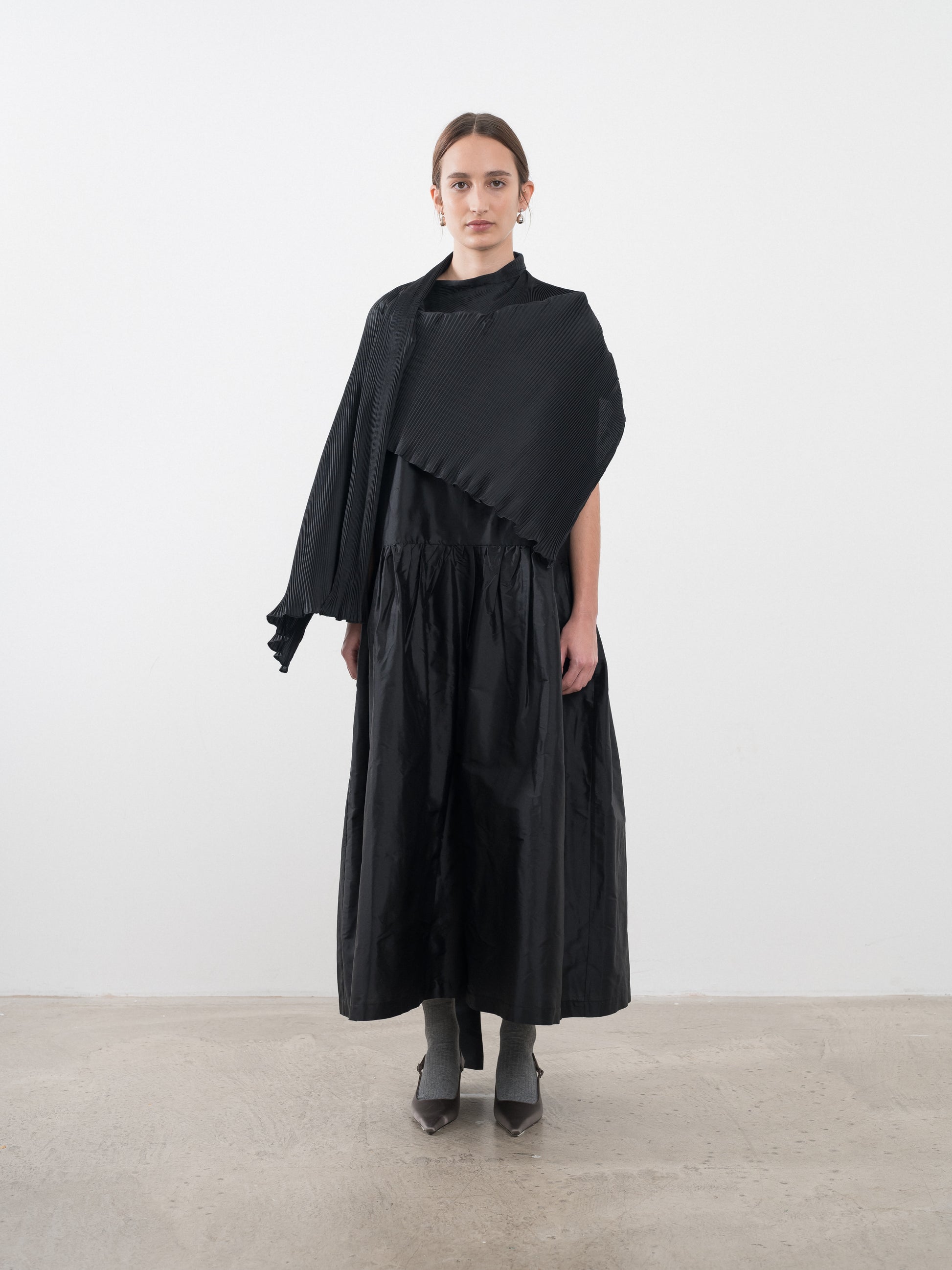 Wear it loosely around the neck, or manipulate the shape and tie it around the waist to show off the flexible pleats.