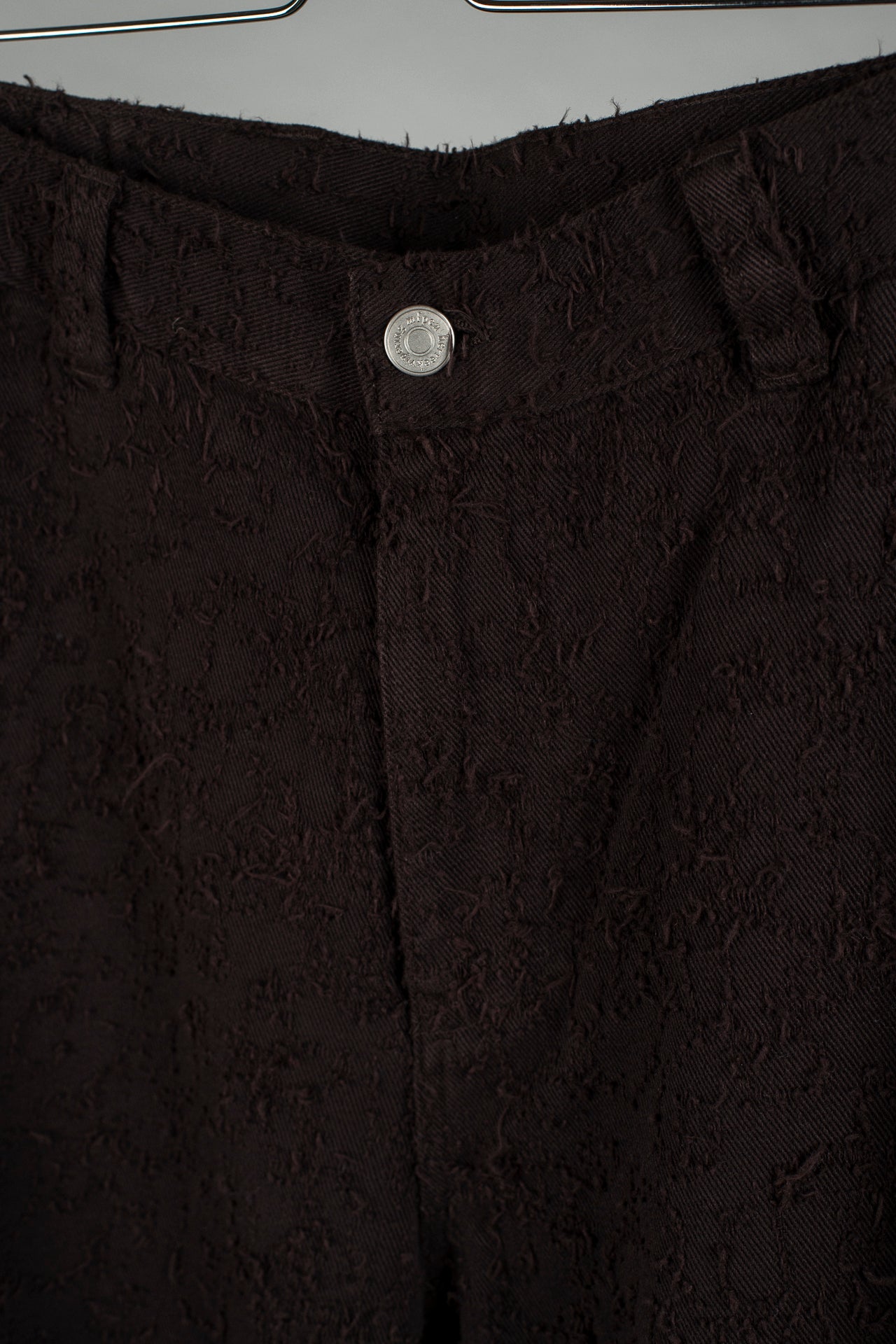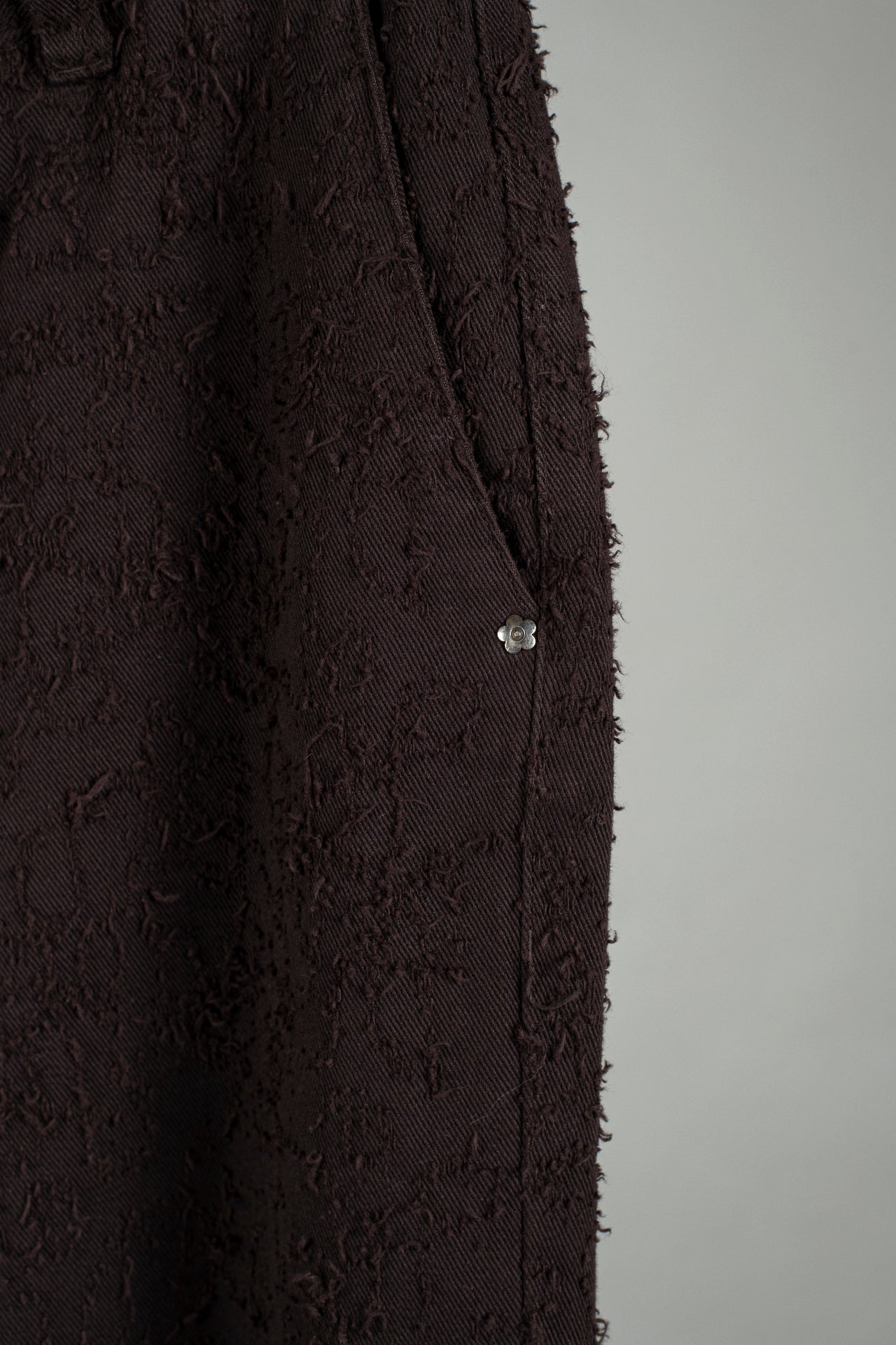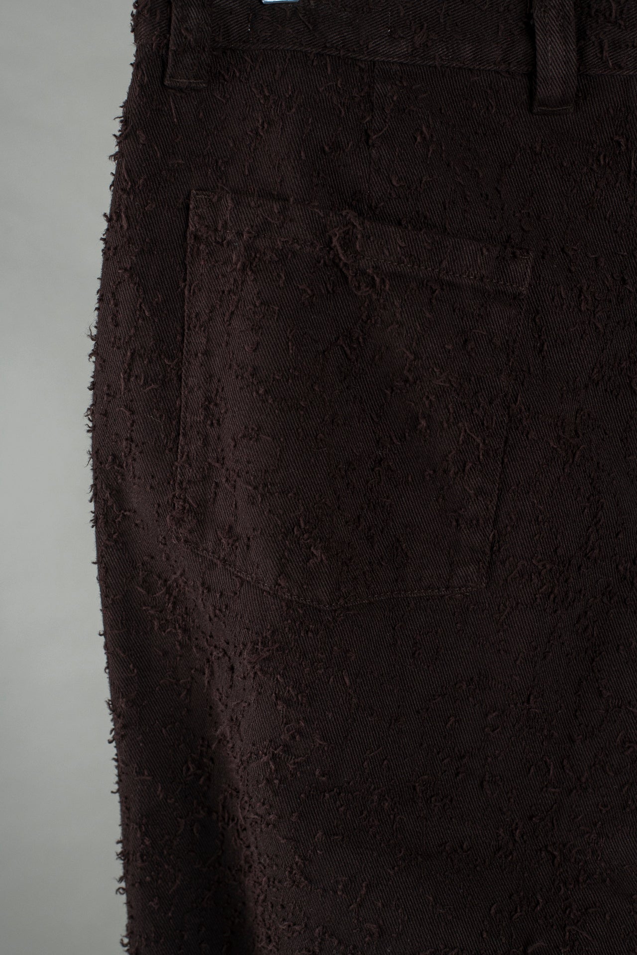 The Punch Out Jeans has a relaxed straight fit with a mid-rise. Featuring side pockets, rear patch pockets, flower rivets, metal button closure and YKK zip fly. Cut from 100% organic cotton corduroy in deep brown, with all-over distressed pattern created with a laser.