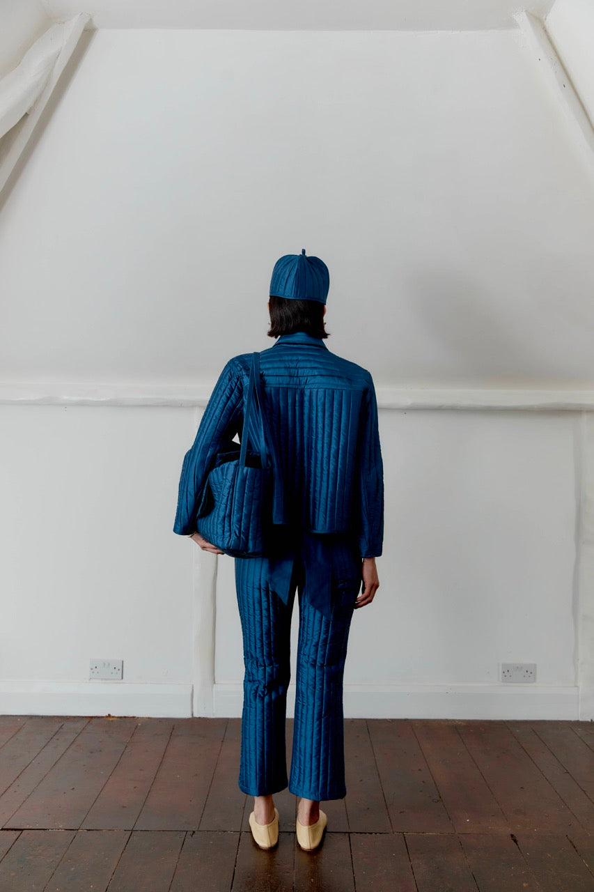 Cawley's ADA jacket is crafted in a rich blue 100% silk dupion and quilted with 100% wool wadding for added warmth, making it ideal for cooler spring evenings. The quilting gives the fabric additional weight, making it a suitable choice for lightweight outerwear. Designed with a single front patch pocket, a covered button front closure, and a classic pointed collar, it balances quiet structure with everyday ease.