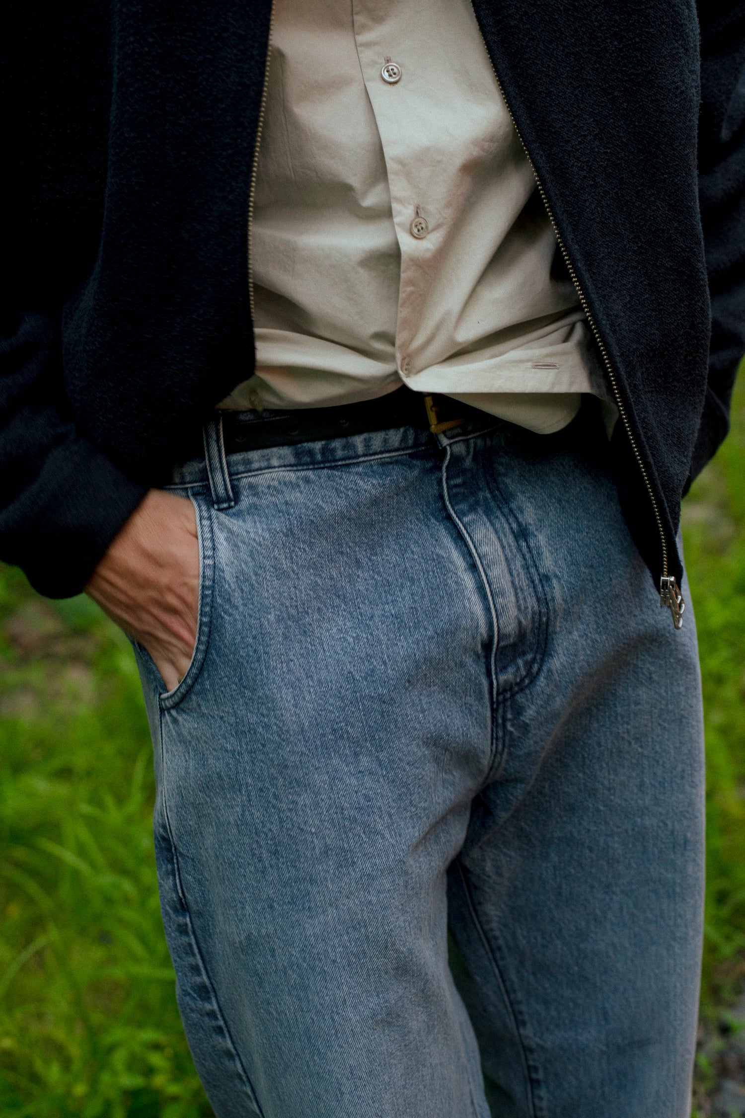 The Regular Jeans have a relaxed regular fit with a mid-rise. Made with side pockets, rear patch pockets, metal button closure and YKK zip fly. Cut from garment washed organic cotton denim with a dry feel in faded light grey.