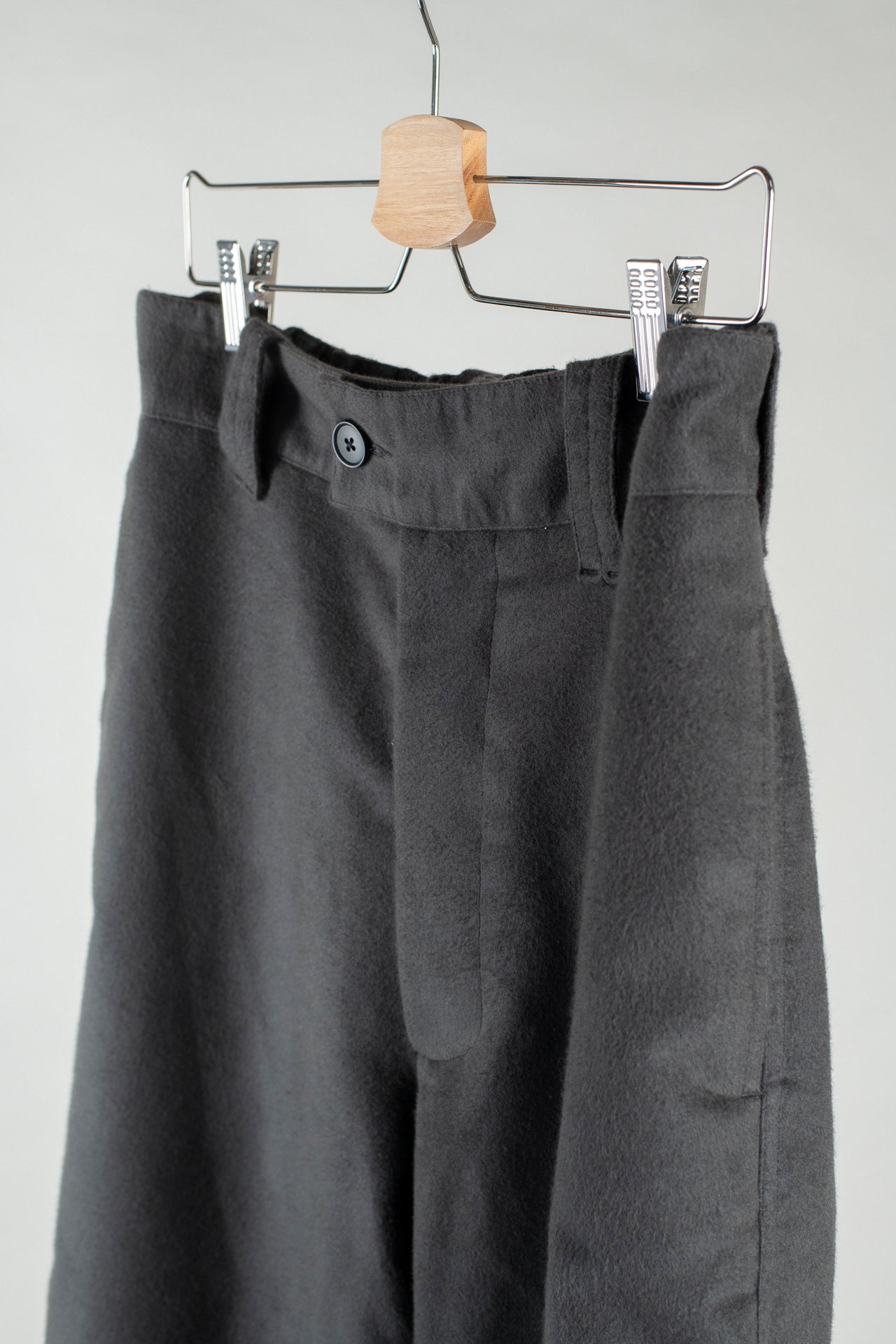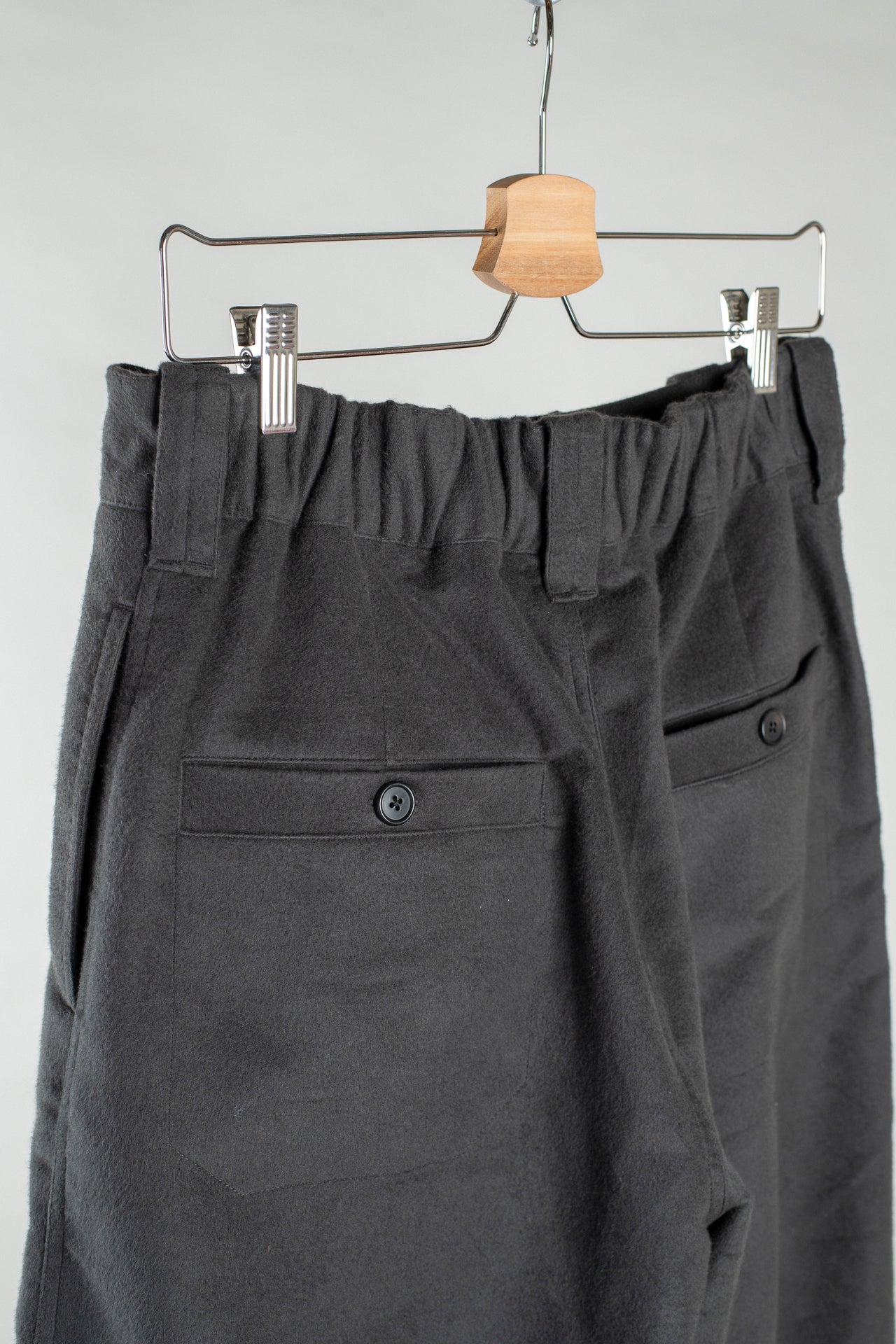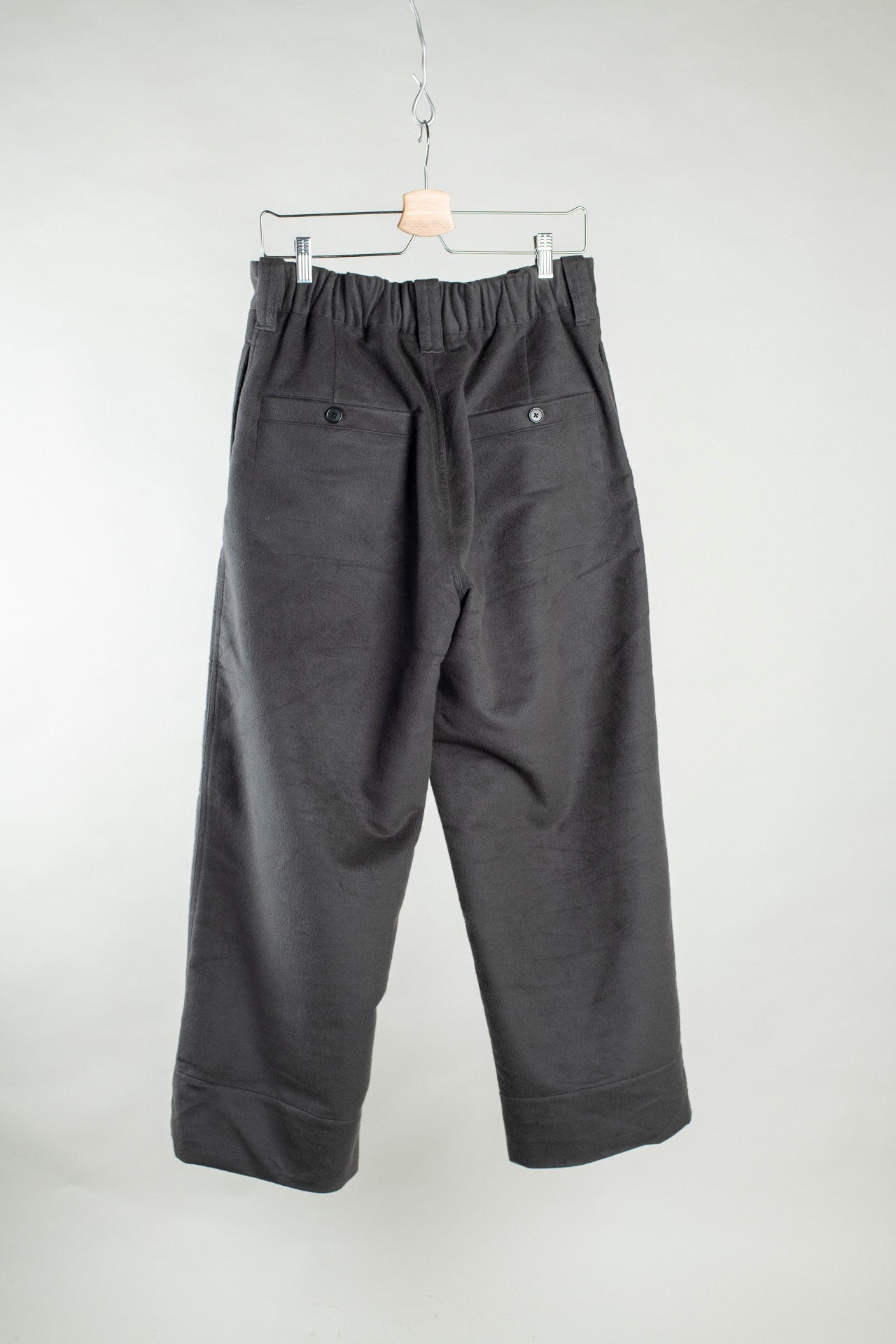 Some say it's the perfect fall/winter pant. Wide straight fit. Side pockets with two back pockets with button closure. Elastic waistband around the back for all-day comfort and fit. Thick cut belt loops, and extended front button closure with high-quality zipper. Biased bound seams throughout. High cut bottom hem for a unique look.