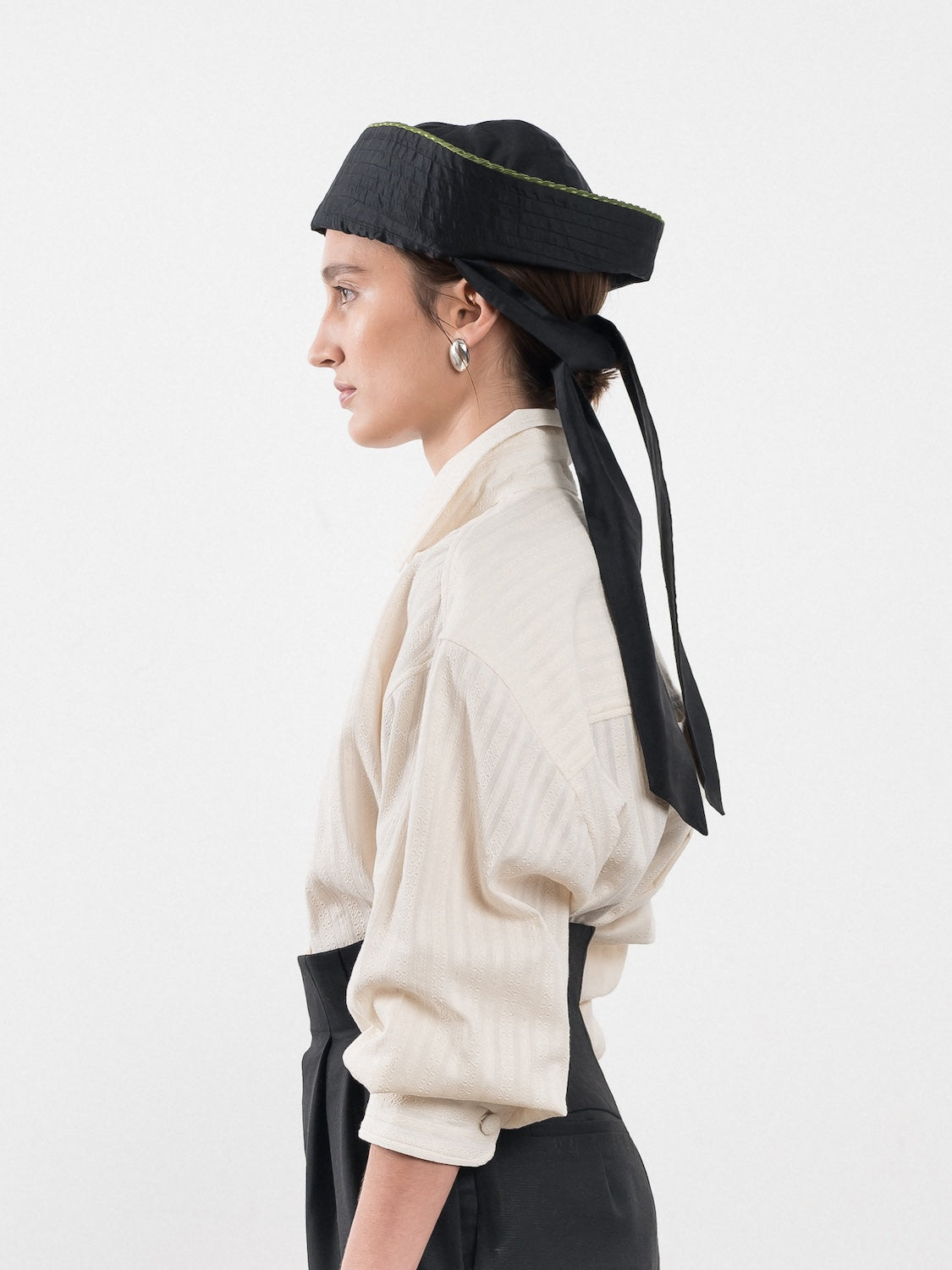 A classic sailor’s hat updated in a silk dupion with matching trim. A fun accessory to brighten any ensemble.