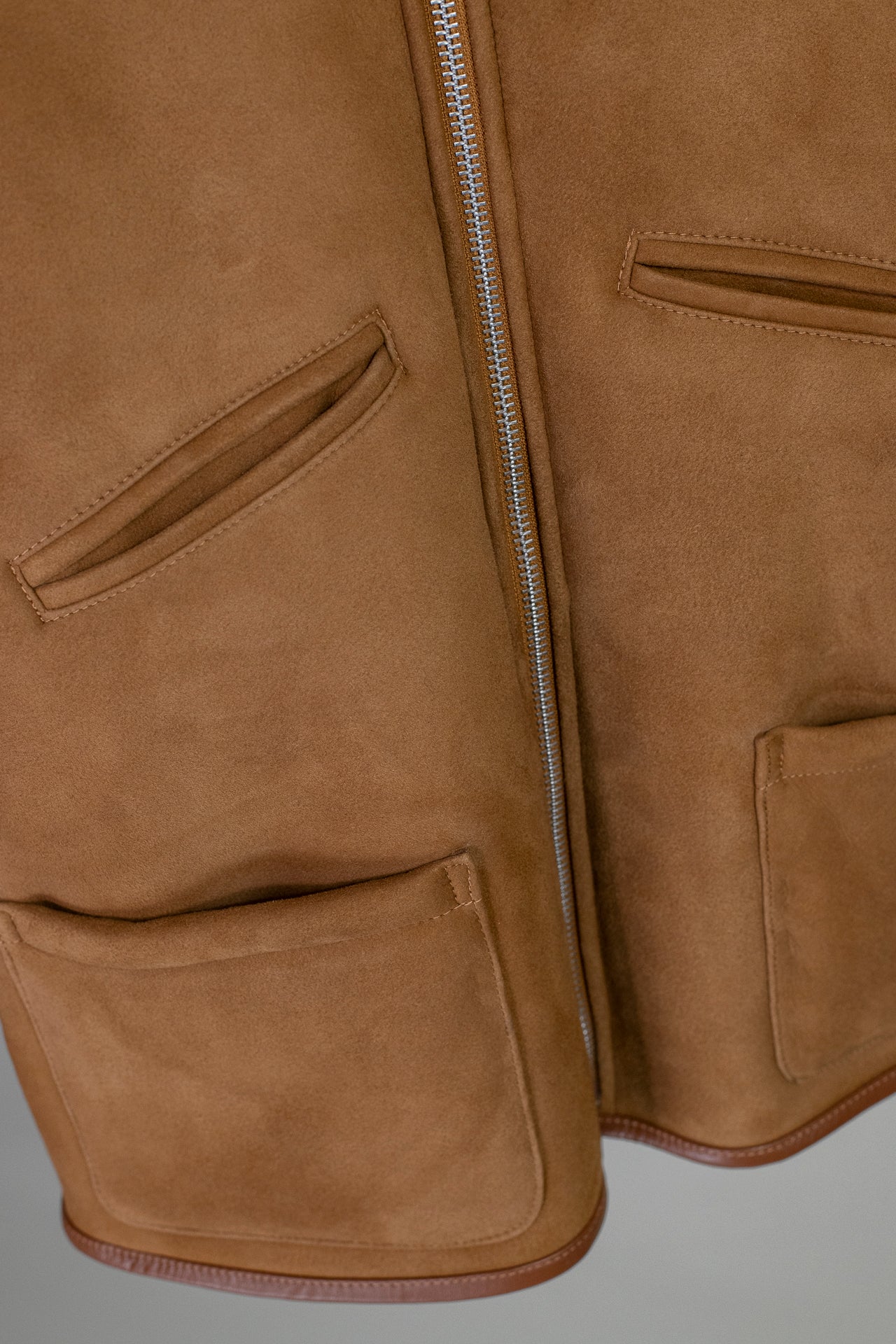 The flying jacket is inspired by vintage aviation jackets. With a suede back and curly hair sheepskin interior, the jacket features a fur collar, two patch pockets, side jet pockets, leather nappa binding, and an overlapping zip closure.