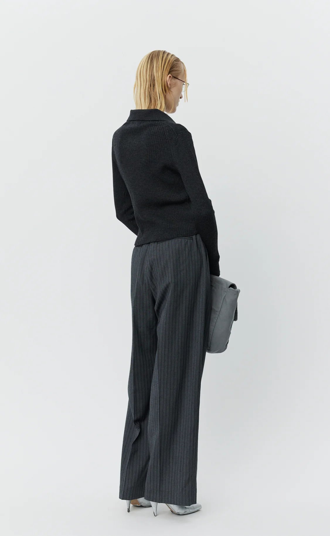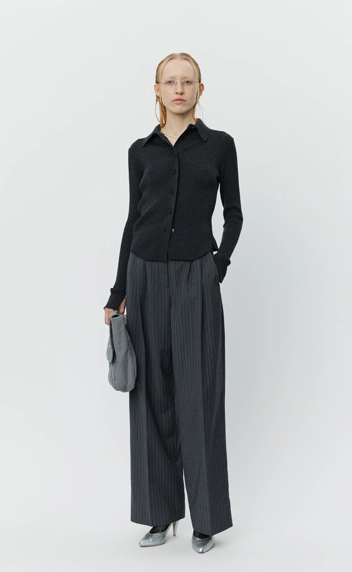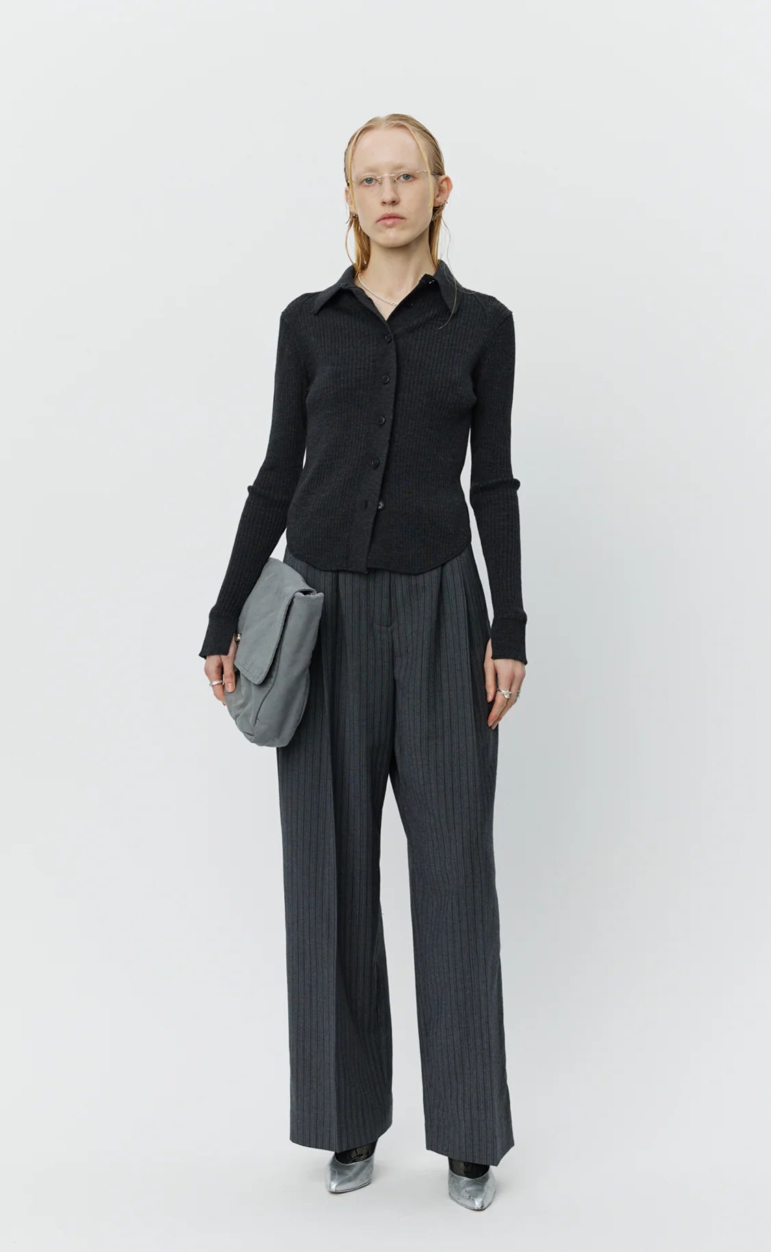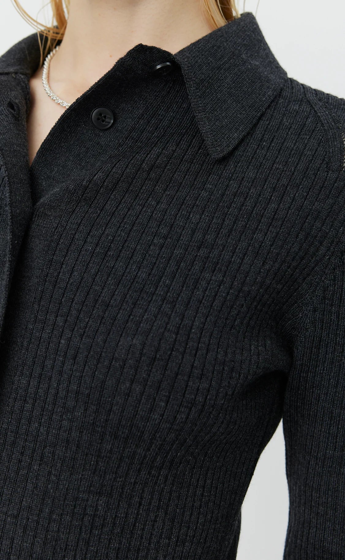 The Knitted Rib Shirt has a slim fit with a slightly curved hem. Featuring a spread collar, button placket and slits at the sleeve hems. Knitted from a heather brown fine merino wool yarn with a 4x2 rib knit throughout the body.