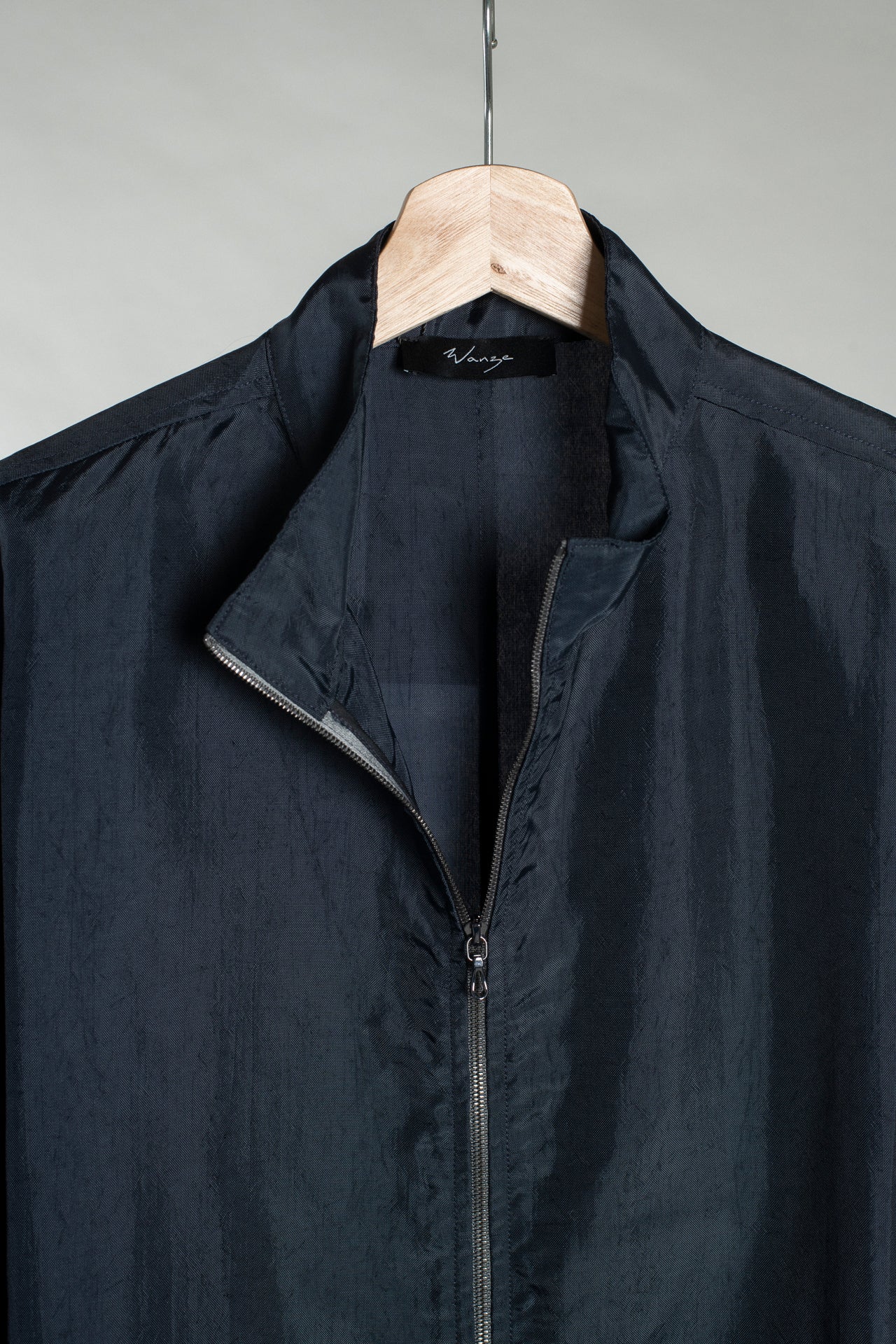 at the front shoulder and wraps to the back of the body, inseam pockets are inserted at the waist. Elasticated hems at the body and sleeves add a casual feel, while the two-way Riri zip closure adds a luxe finish.