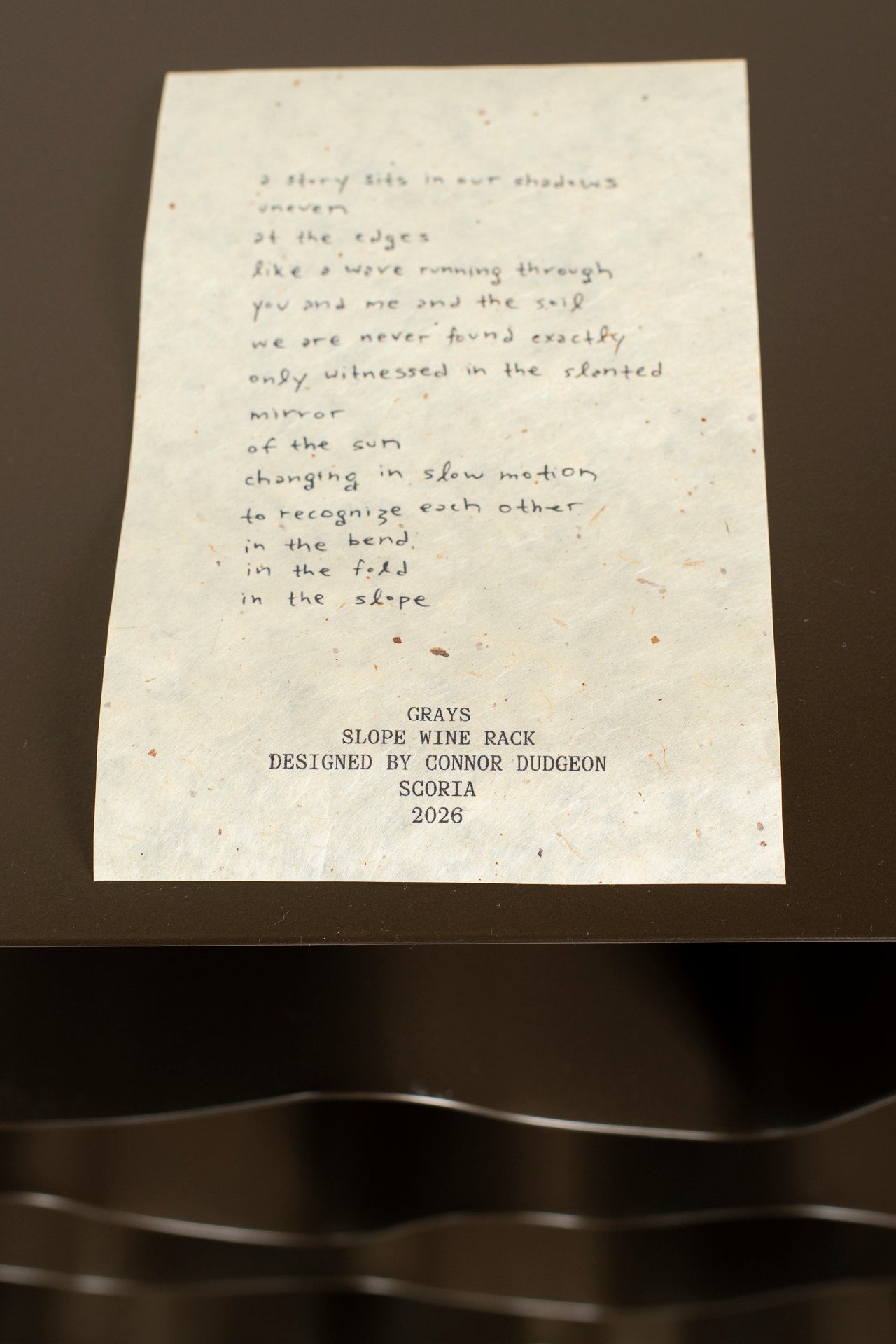 Designed by Grays Owner Connor Dudgeon. He built the first prototype in the studio. Cutting, bending, welding, and sandblasting it over the course of a week.