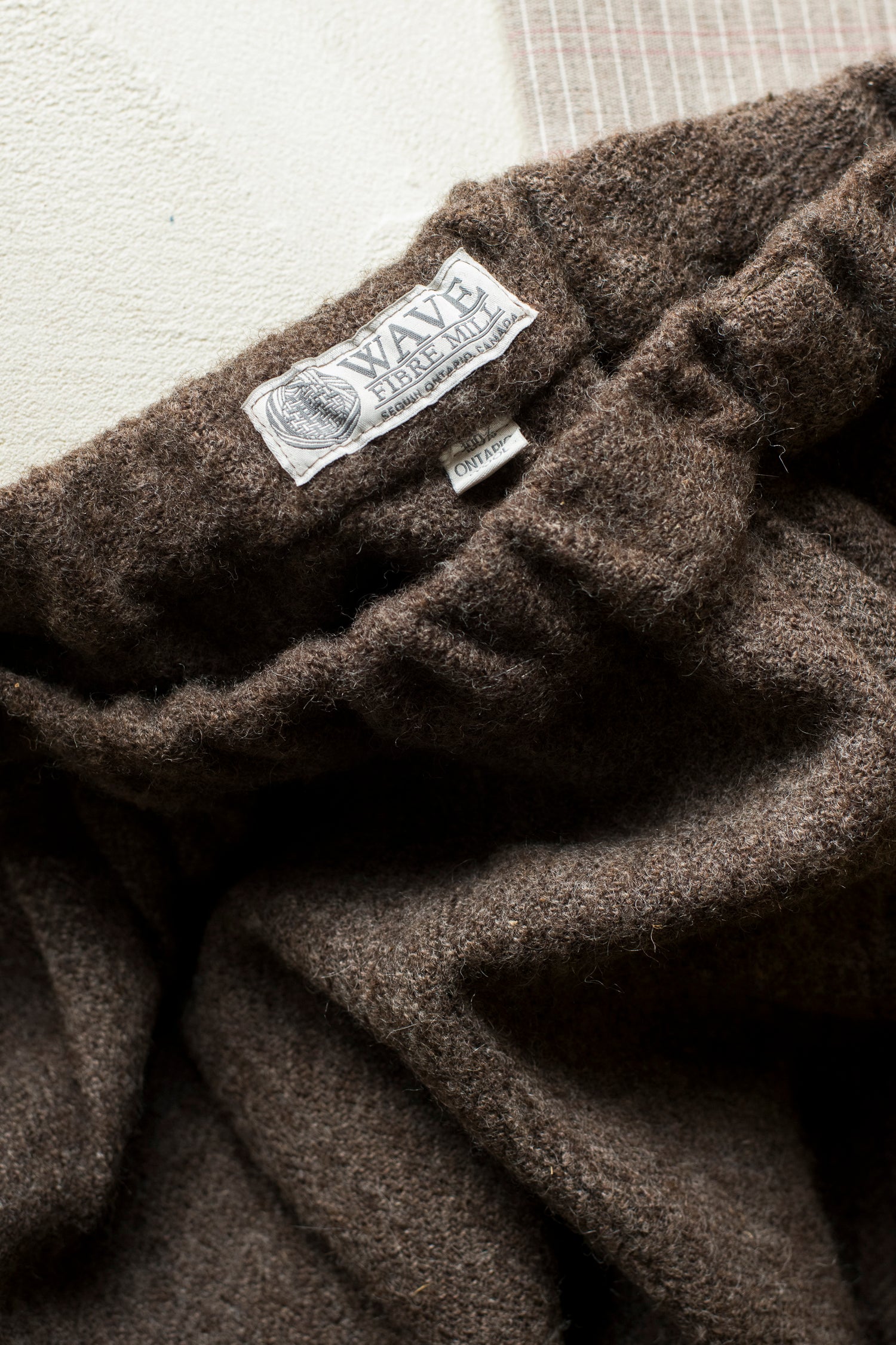 hand made at Wave Fibre Mill in Seguin, Ontario. washed, spun, woven, and sewn all under the same roof.